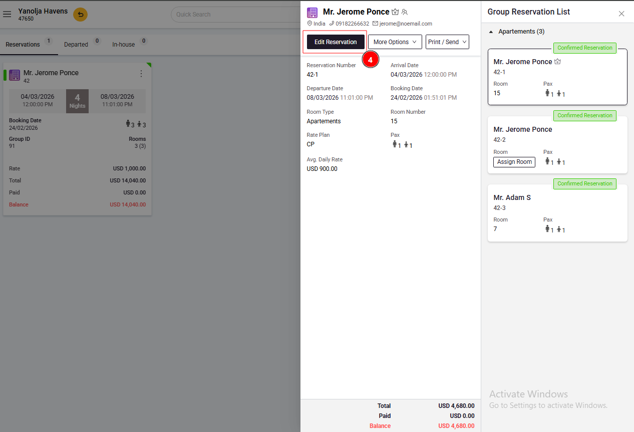 Group booking is booking more than one room for a group of people at a time. Due to some circumstances, when the hotelier received a request to make a change in arrival or departure dates for the whole group, that is required to update the system as well, which is done with a few clicks.