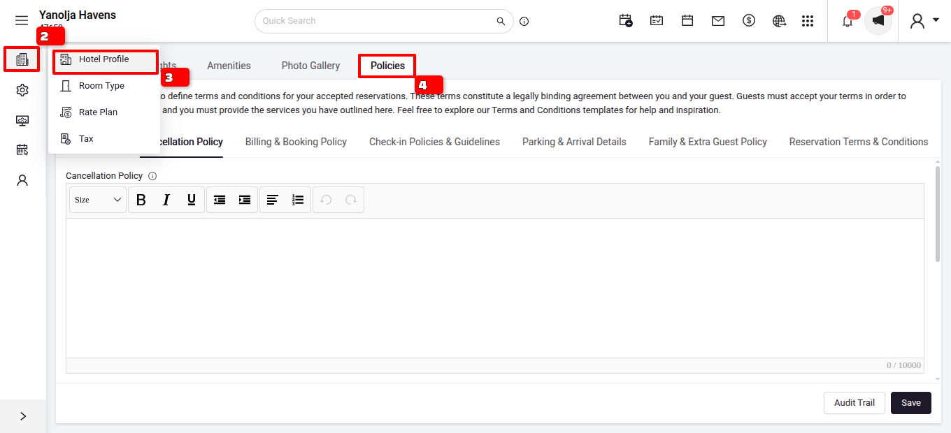 Go to Hotel profile>Policies>Cancellation Policy.