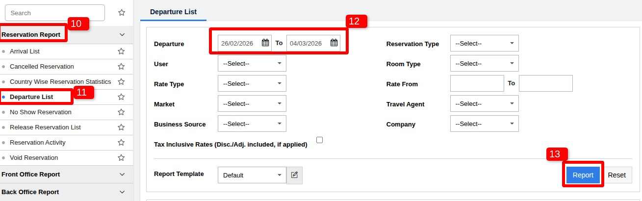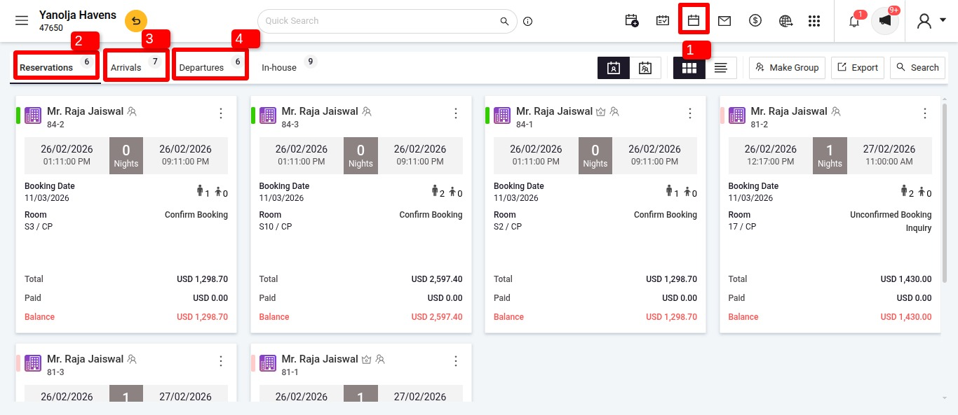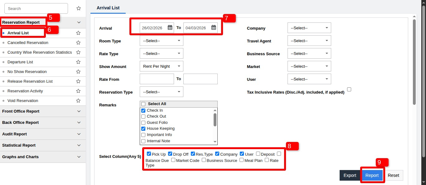 - Select the desired list: Reservation List, Arrival List, or Departure List.