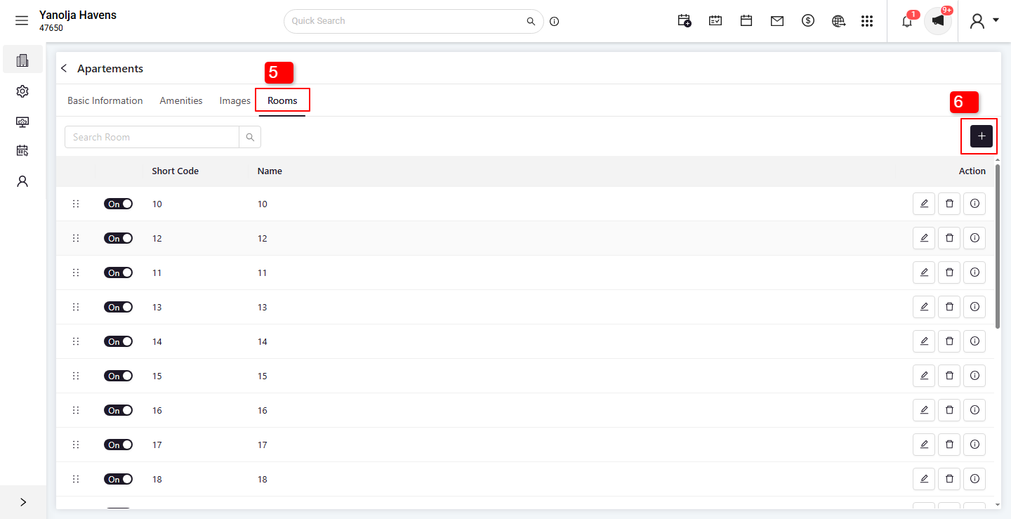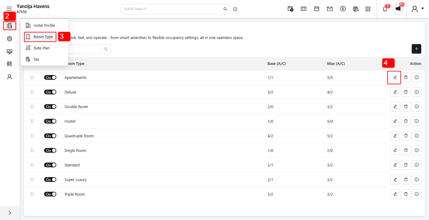 4. Find the Room Type in which you want to create the room. Click on the Edit icon for that Room Type.
