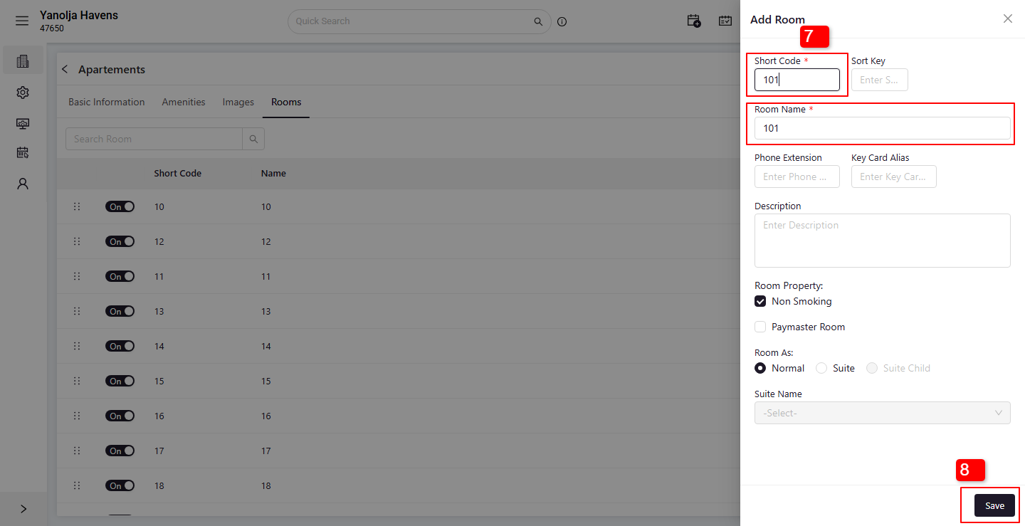 7. the Short Code and Room Name in the required fields.