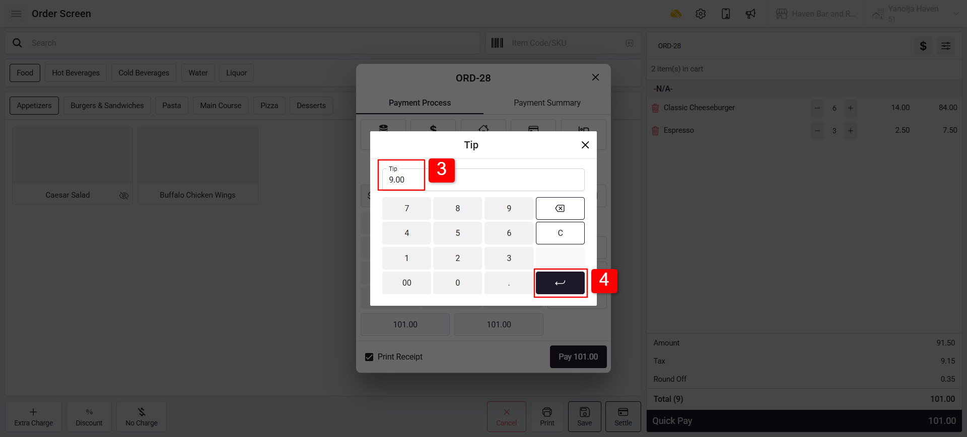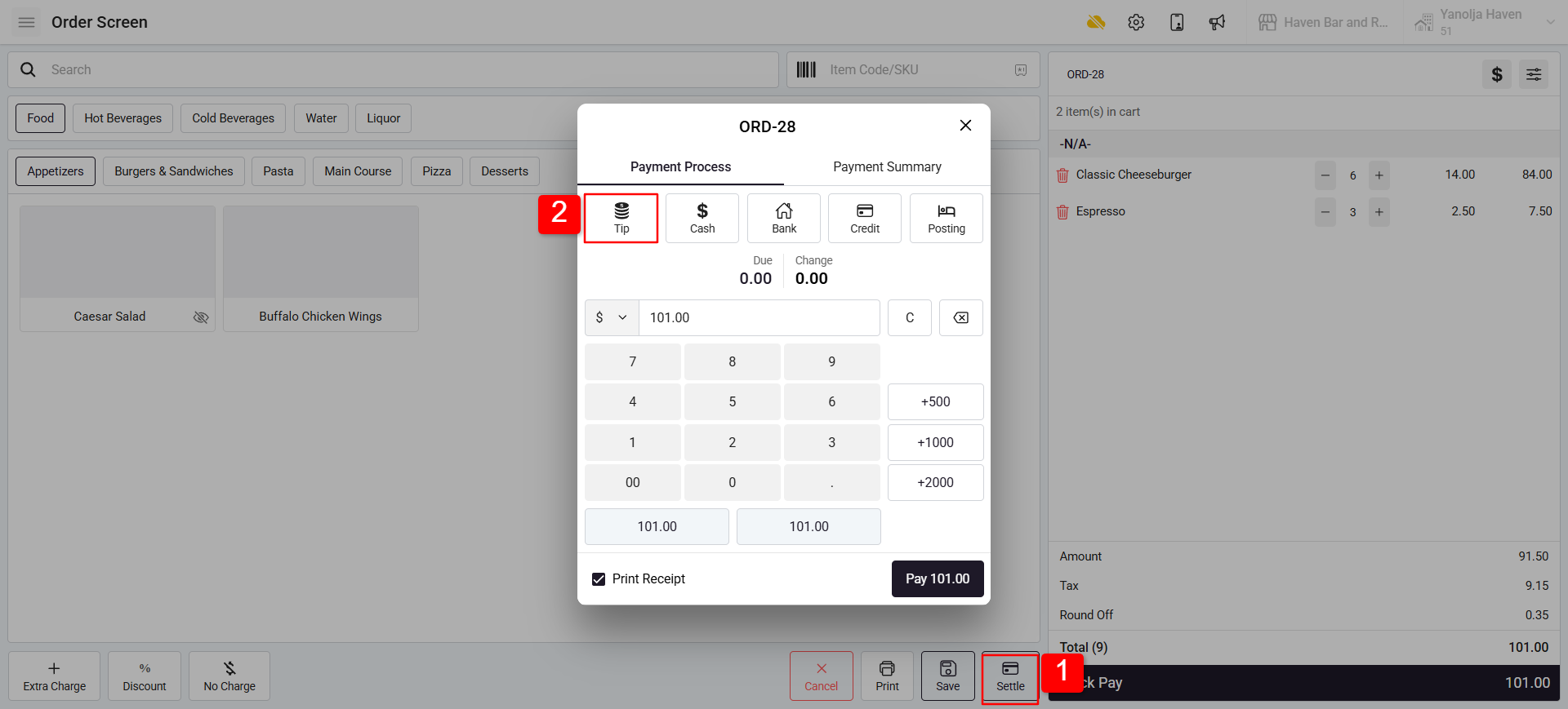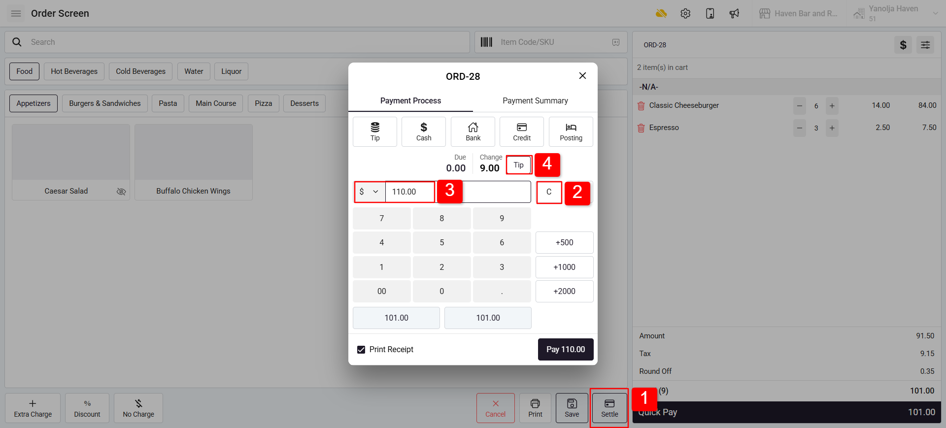 If a guest pays more than the bill amount and asks you to keep the remaining amount as a tip, the system allows you to convert the extra amount into tips during settlement.