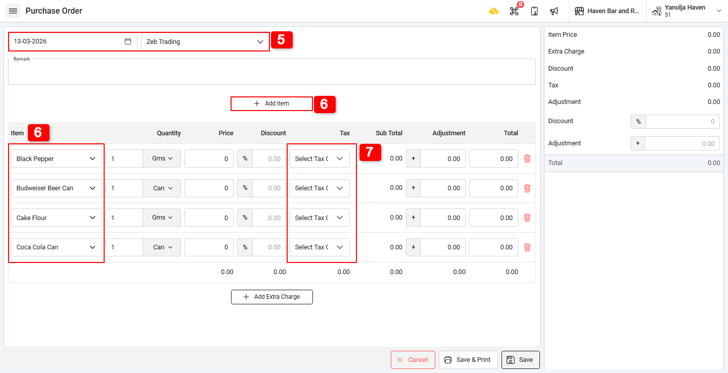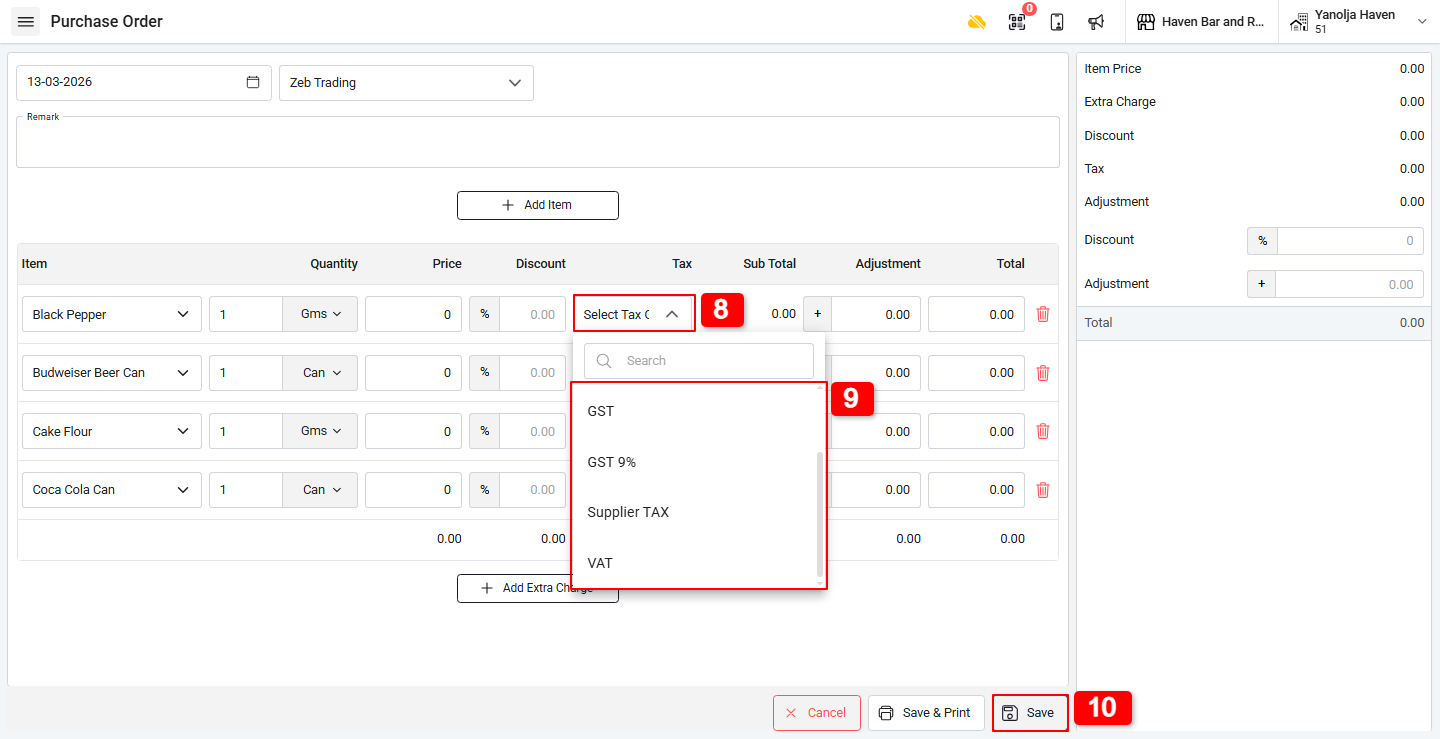 To apply tax to purchase orders in POS, you must first create the tax in the back-end system. Once the tax is created, you can apply it while creating a purchase order.