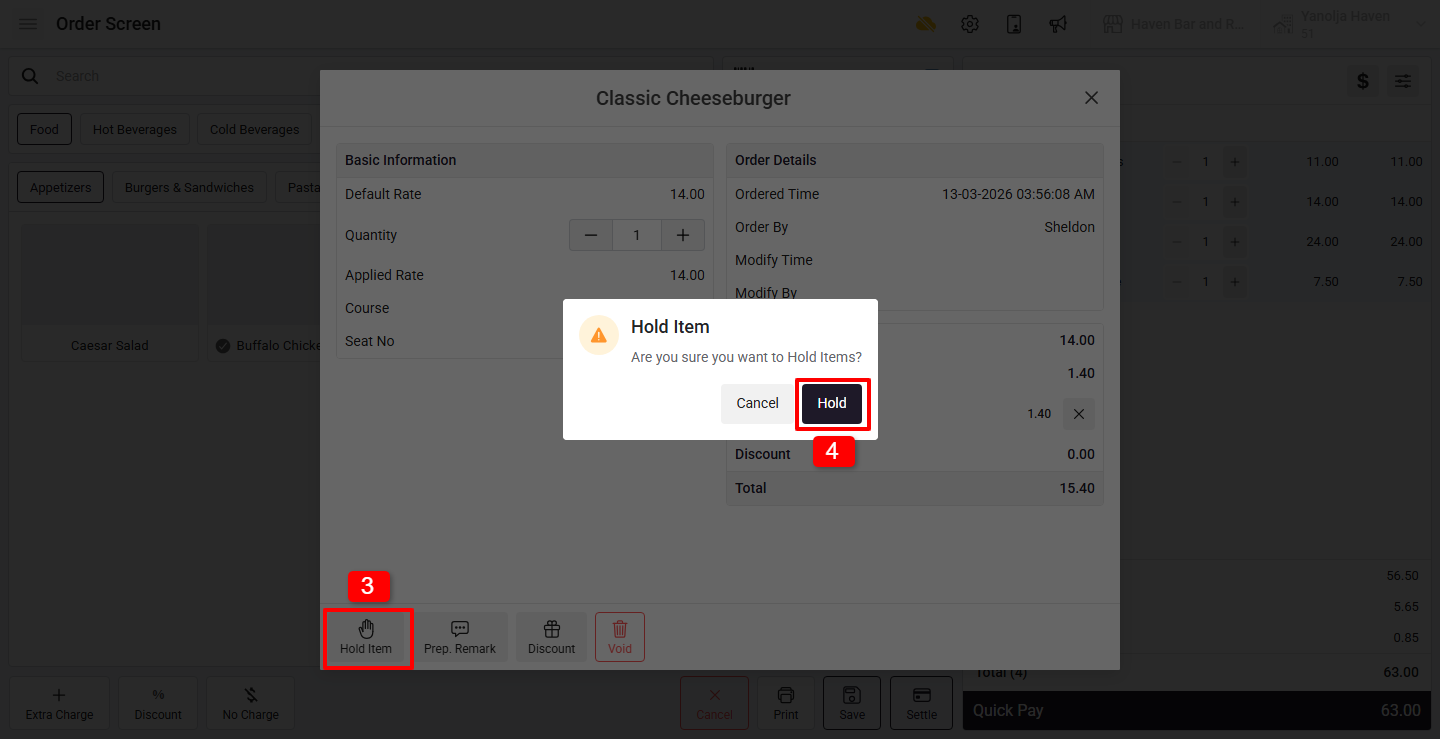 When an item is placed on Hold, it will not appear in the KOT (Kitchen Order Ticket). As a result, the kitchen staff will not start preparing that item until it is released.