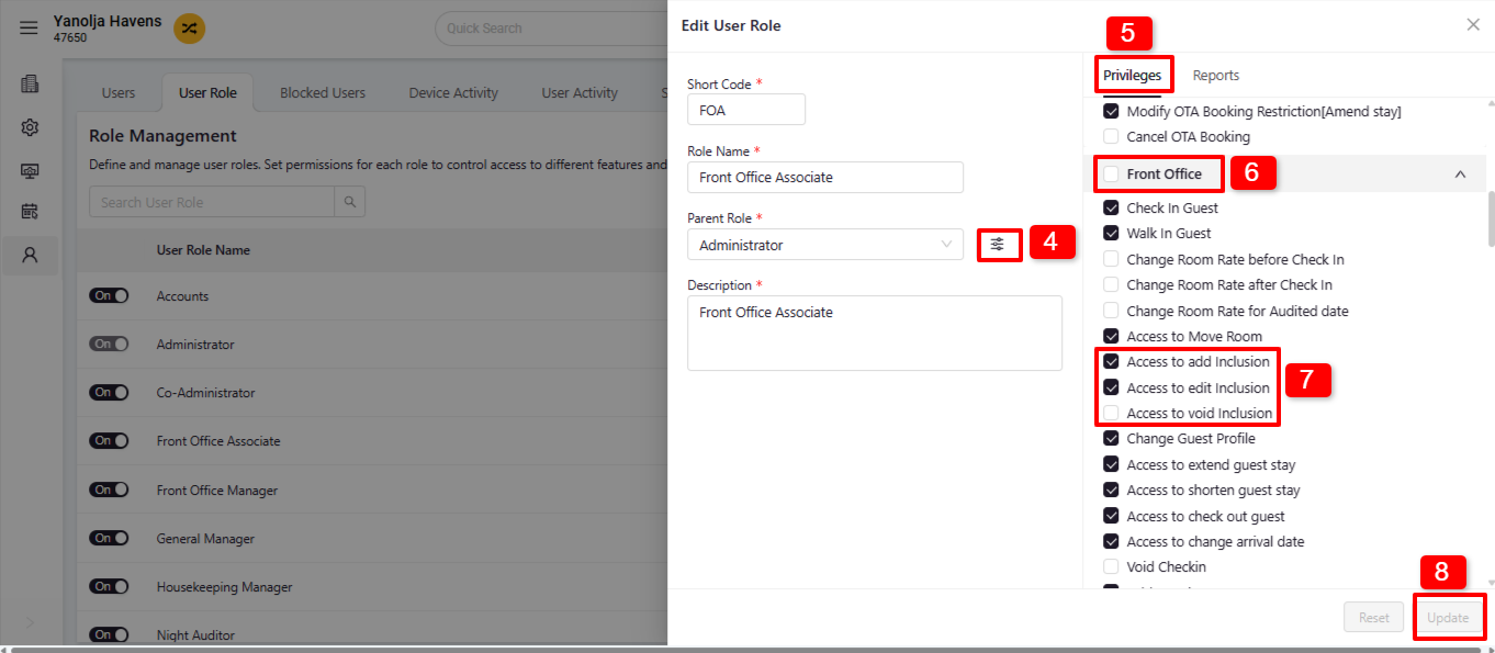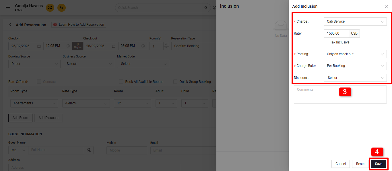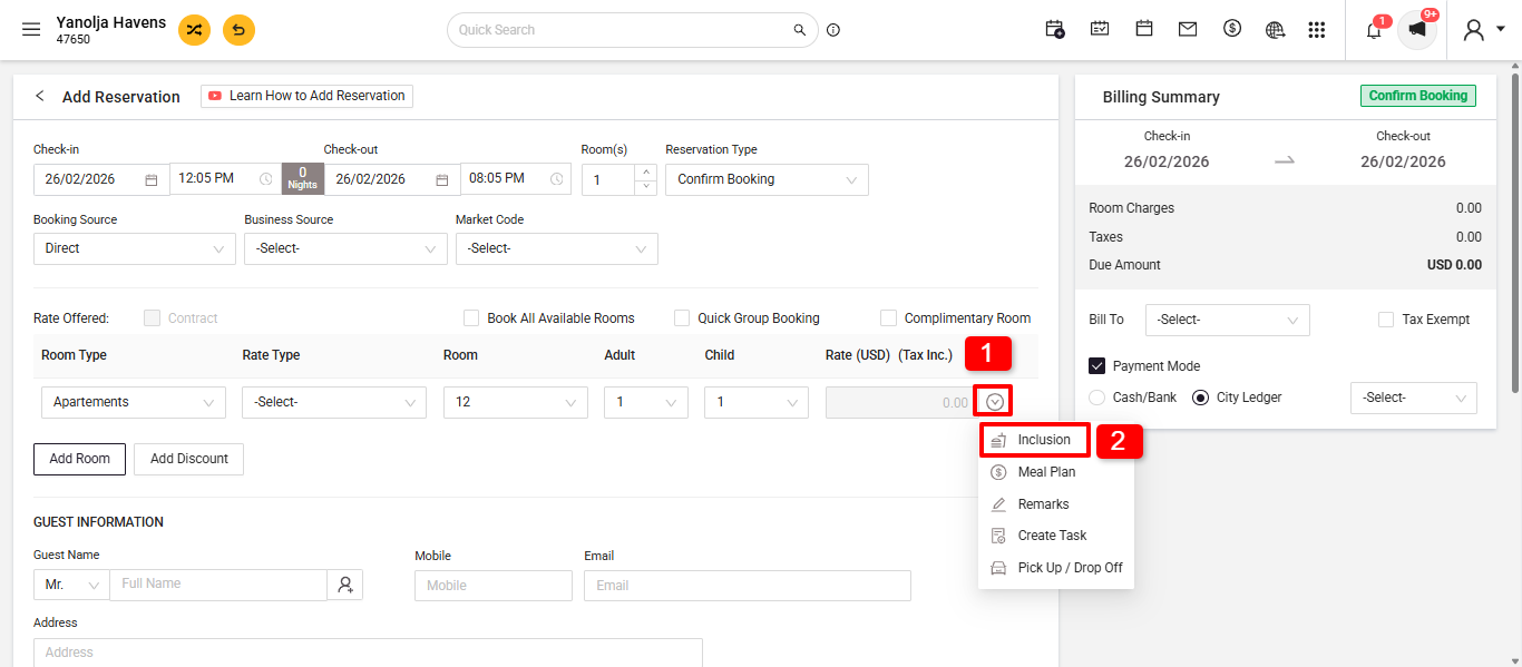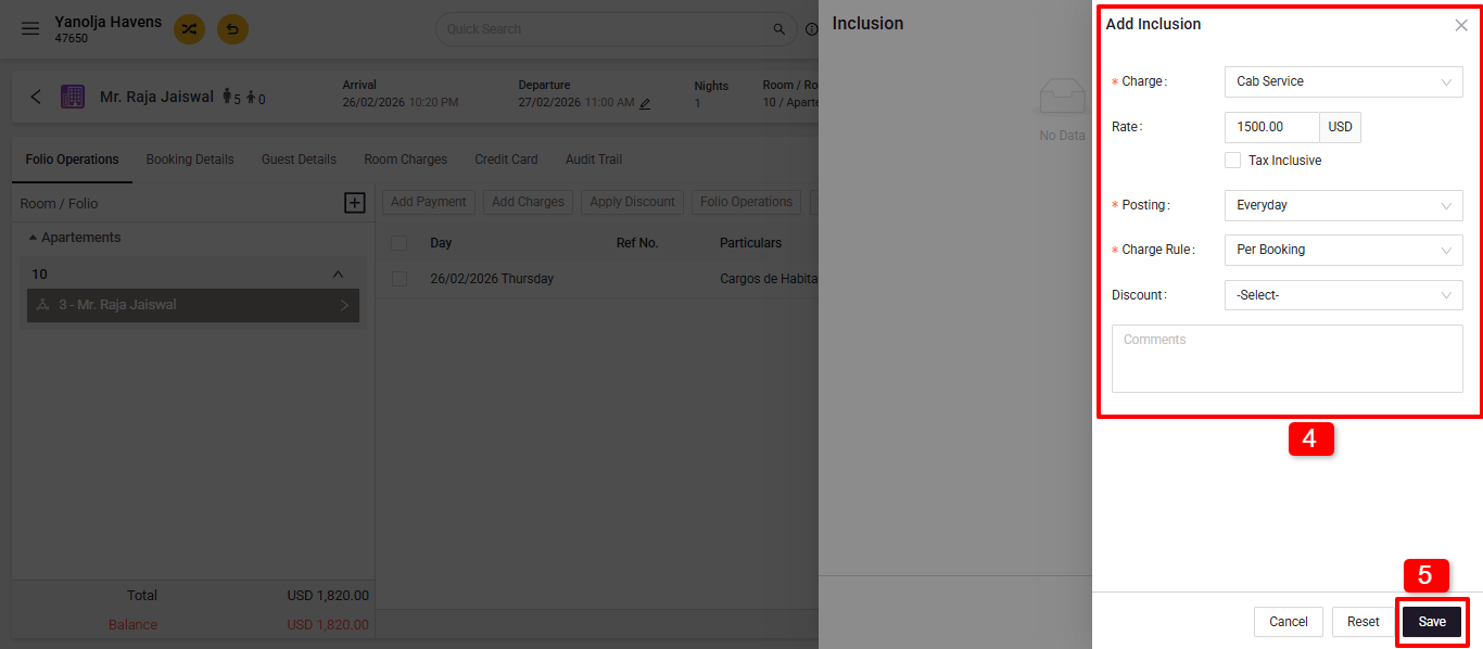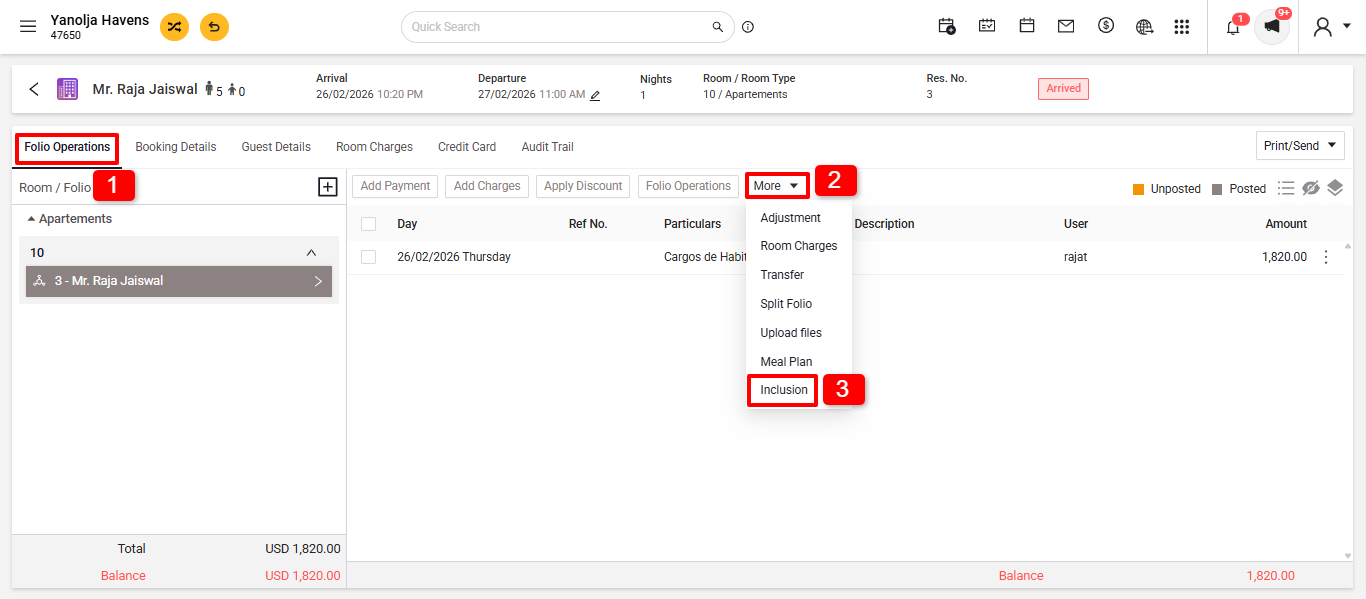 - After Check-in: Navigate to Edit Reservation > Folio Operation > Inclusion + Add Inclusion.