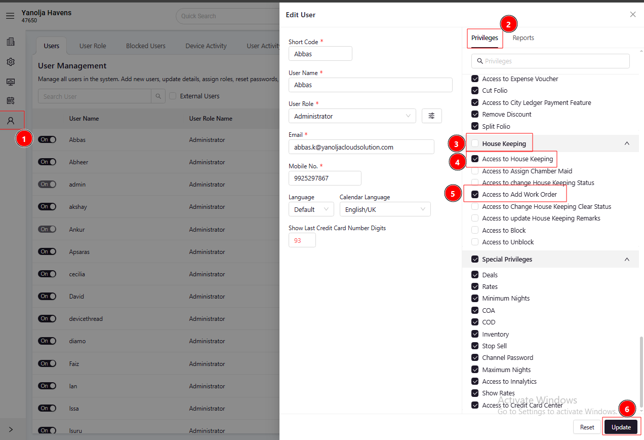 - Navigate to User > Edit User > Privileges > Housekeeping.