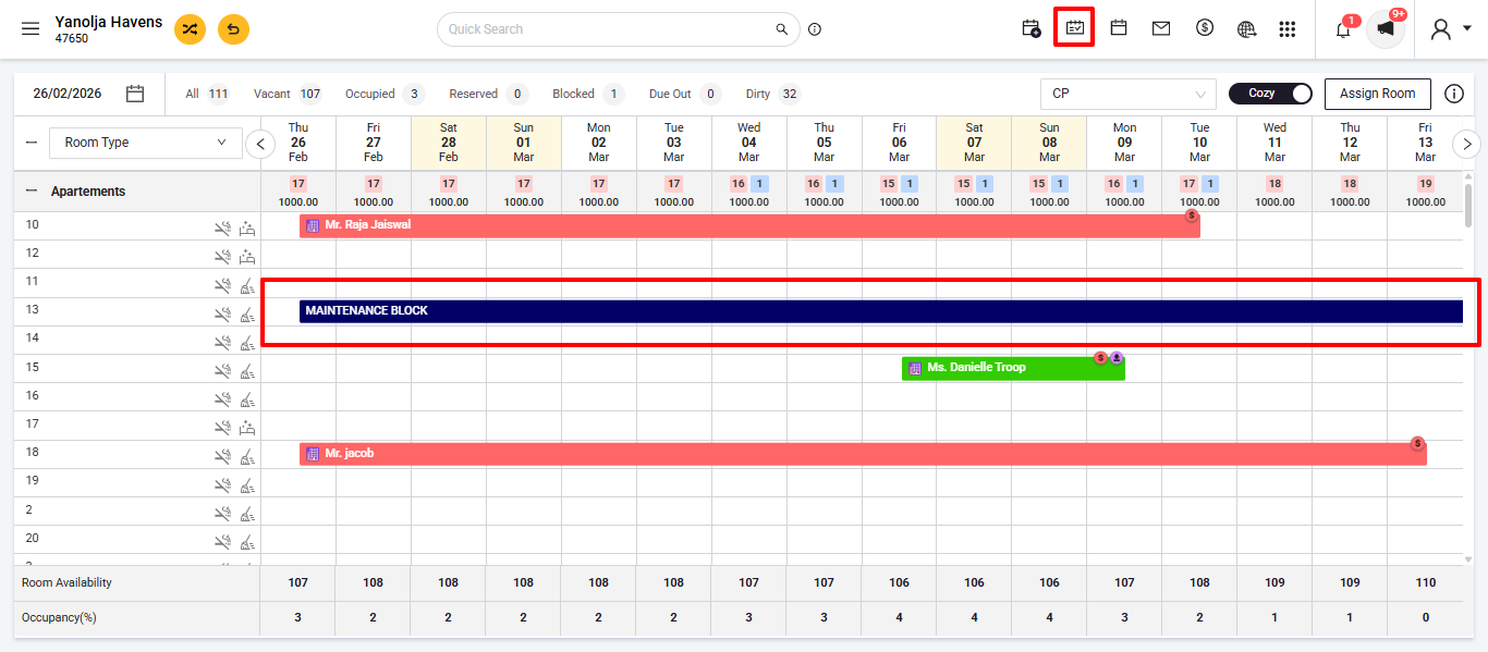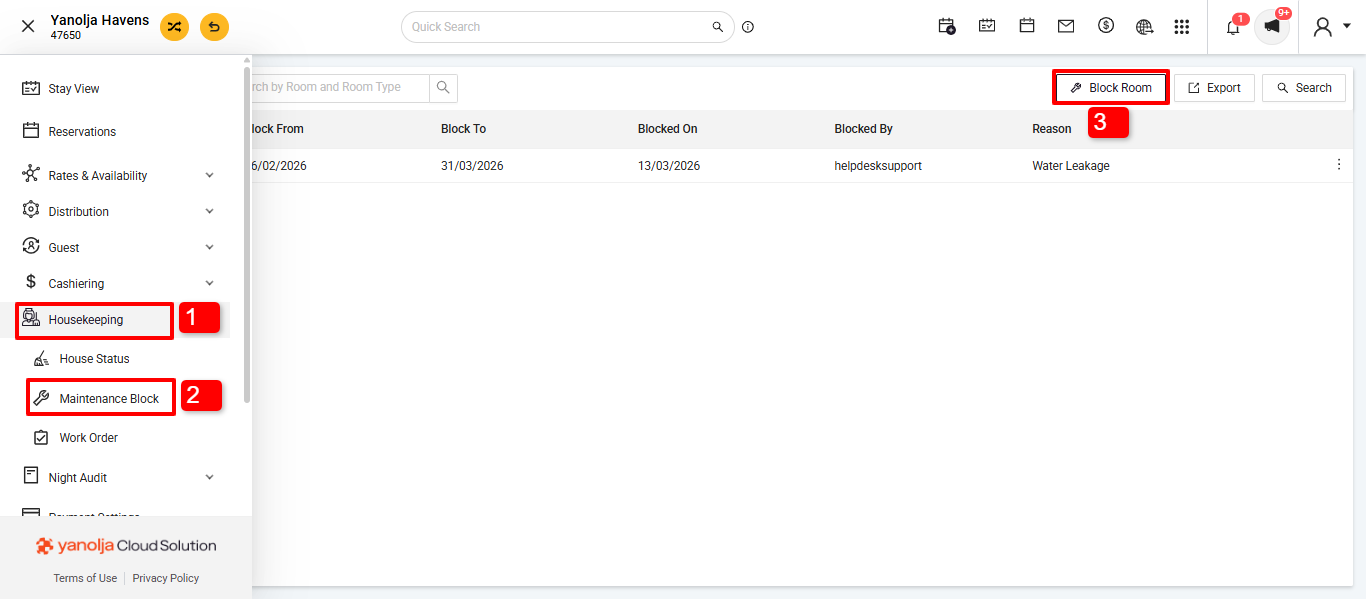 - Navigate to: Menu (≡) > Housekeeping > Maintenance Block.