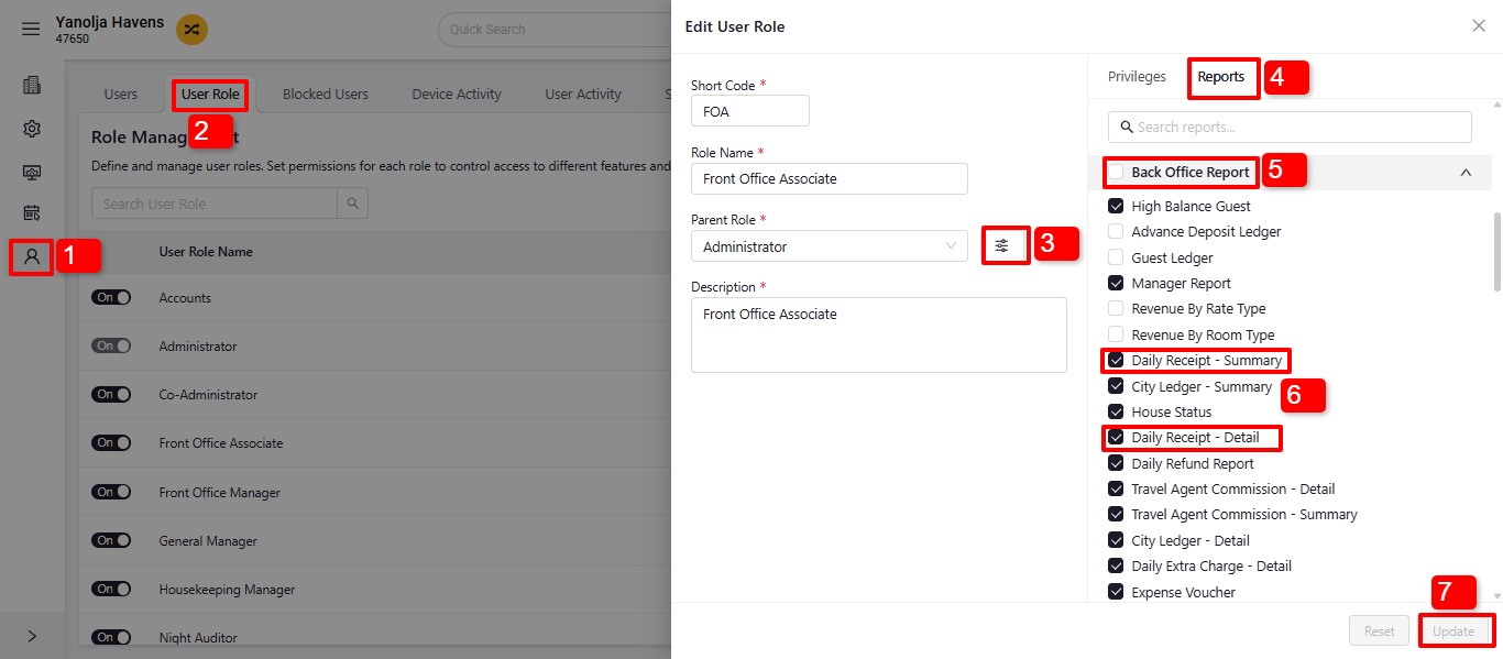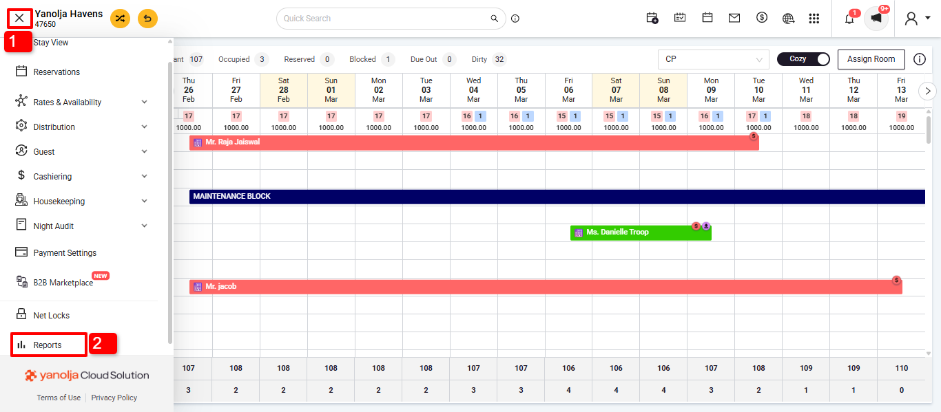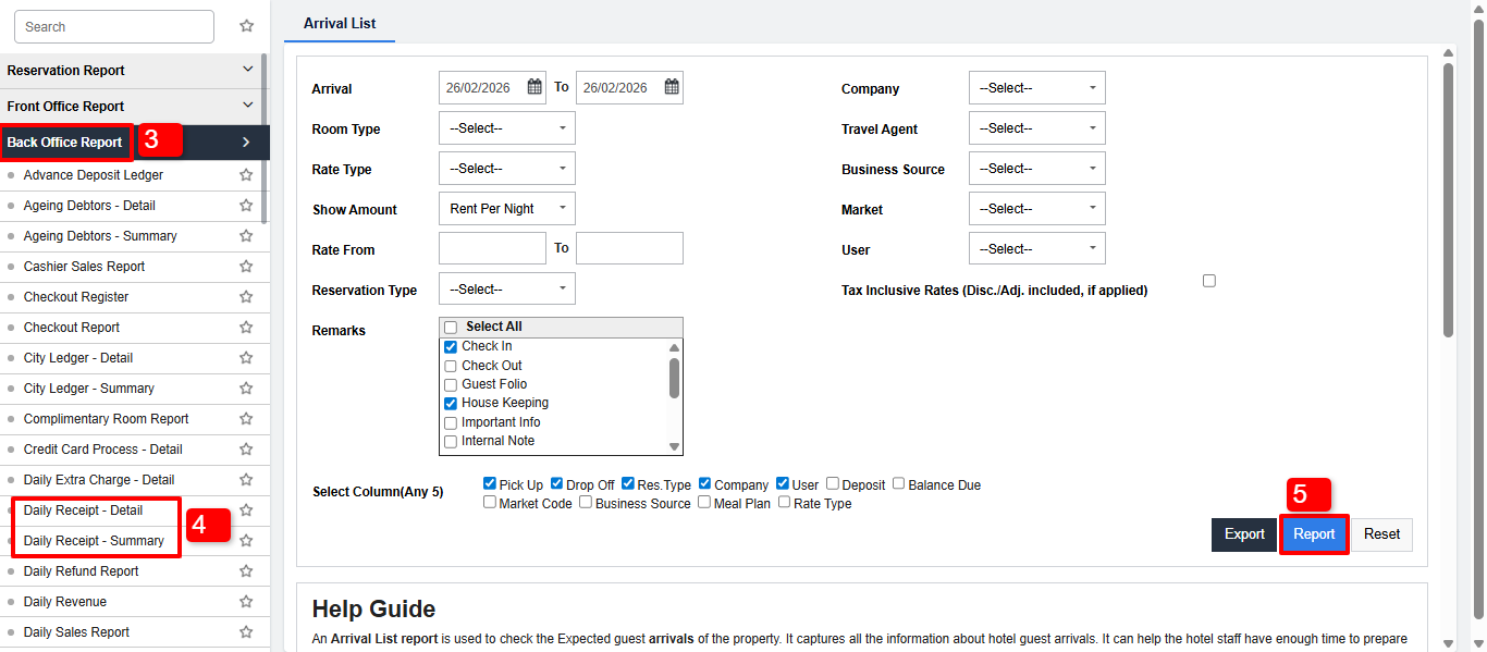 - Daily Receipt – Detail: Offers a detailed breakdown of each transaction, including payment mode, amount, and associated reservation details