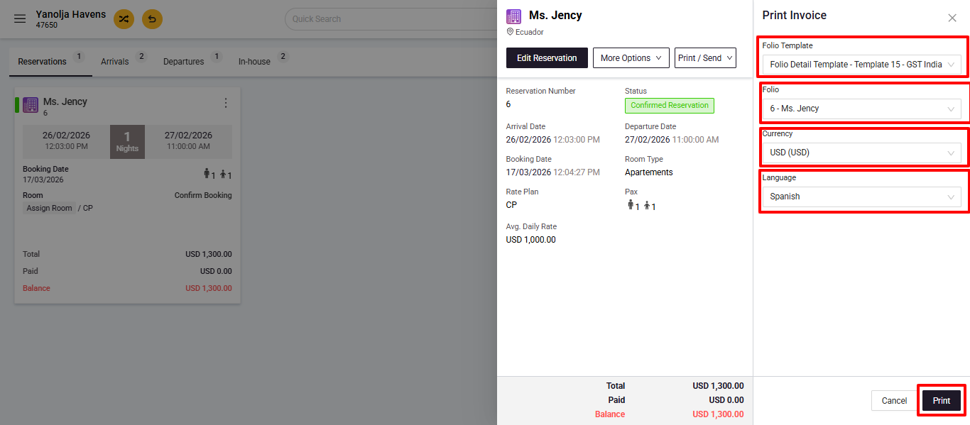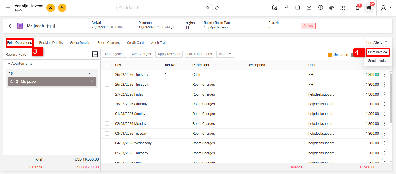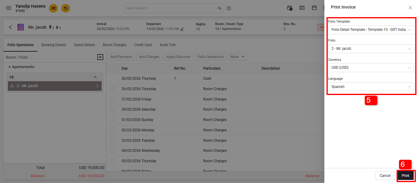 4. Selection of Folio, you can print individual invoices for an individual folio that is created. The invoice will be printed for the folio that is selected in this box.