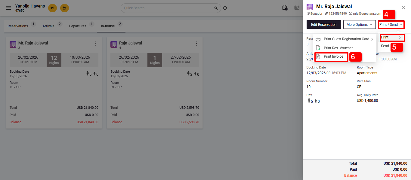Once the Guest settles the bill an Invoice is generated with a unique Invoice no for future reference. That generated invoice Hotelier issue to guest or concerned person at the time of checkout OR may require to print the invoice again at a later stage.