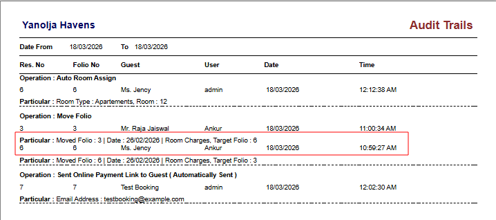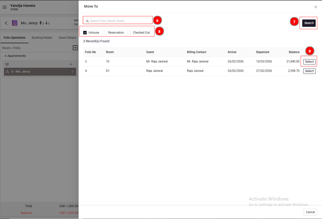 You can transfer room charges or extra charges from one room/folio to another using the Move option available in the Folio Details section.