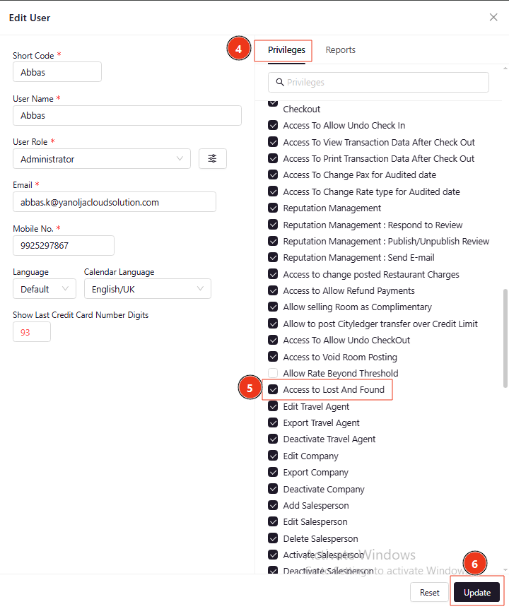 PMS Configuration → User → Edit User → Privileges → Front Office → Access to Lost and Found