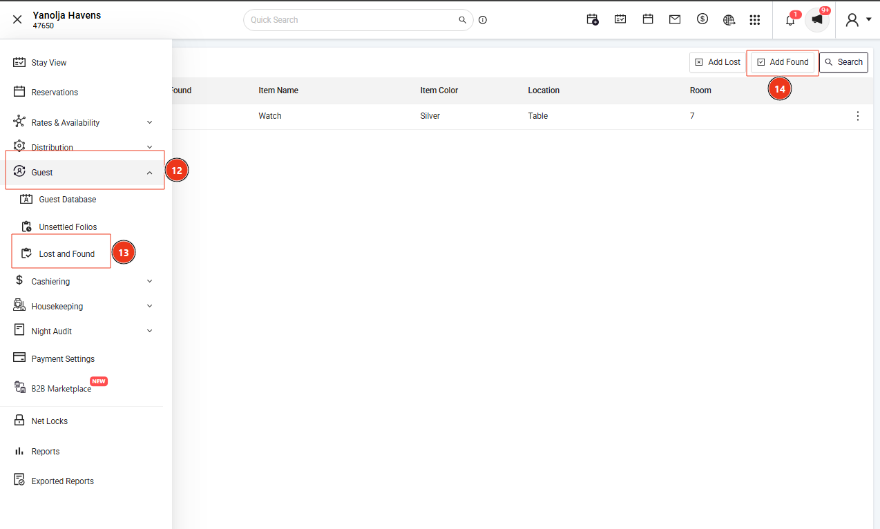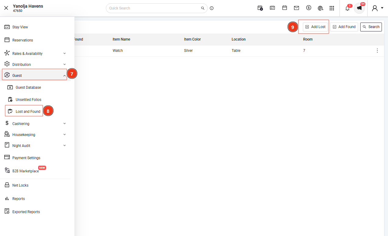 Navigate to Guest → Lost and Found