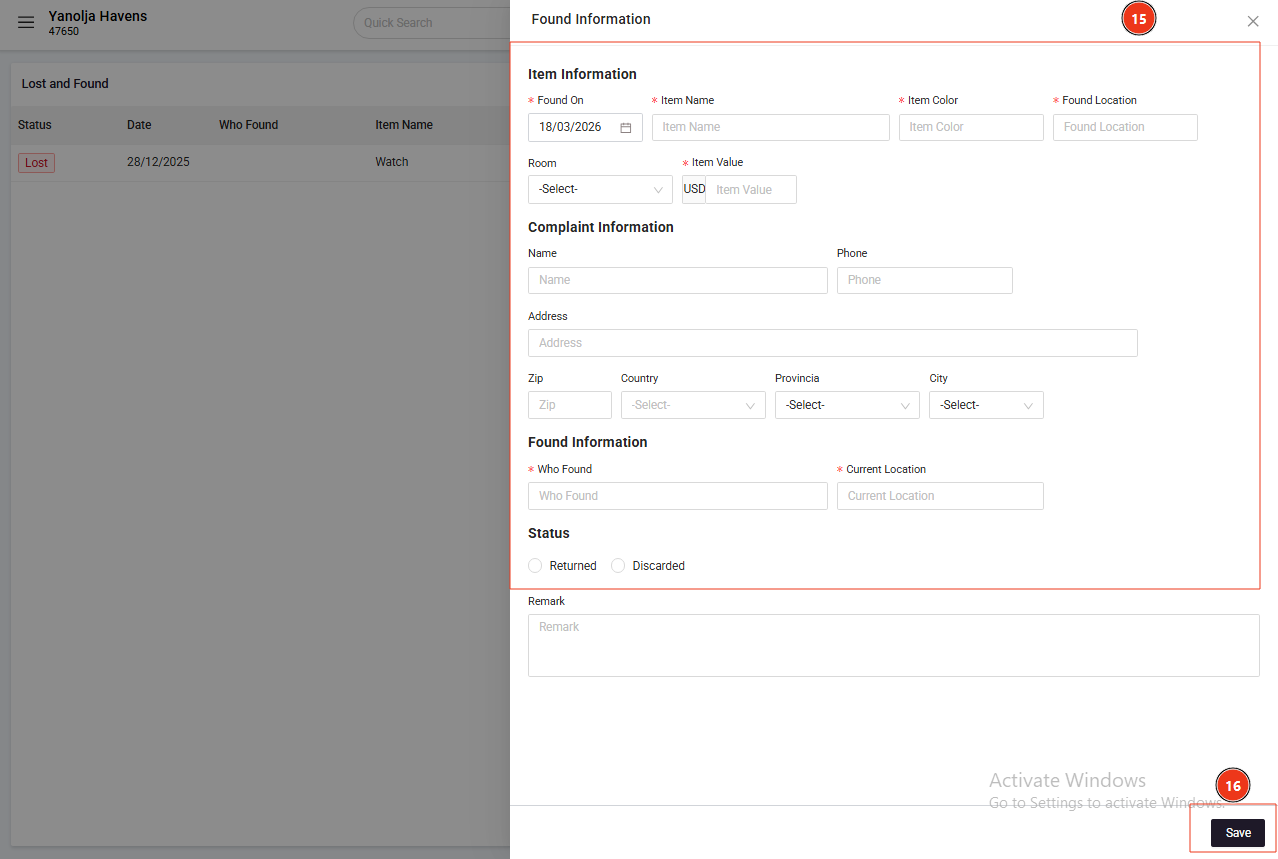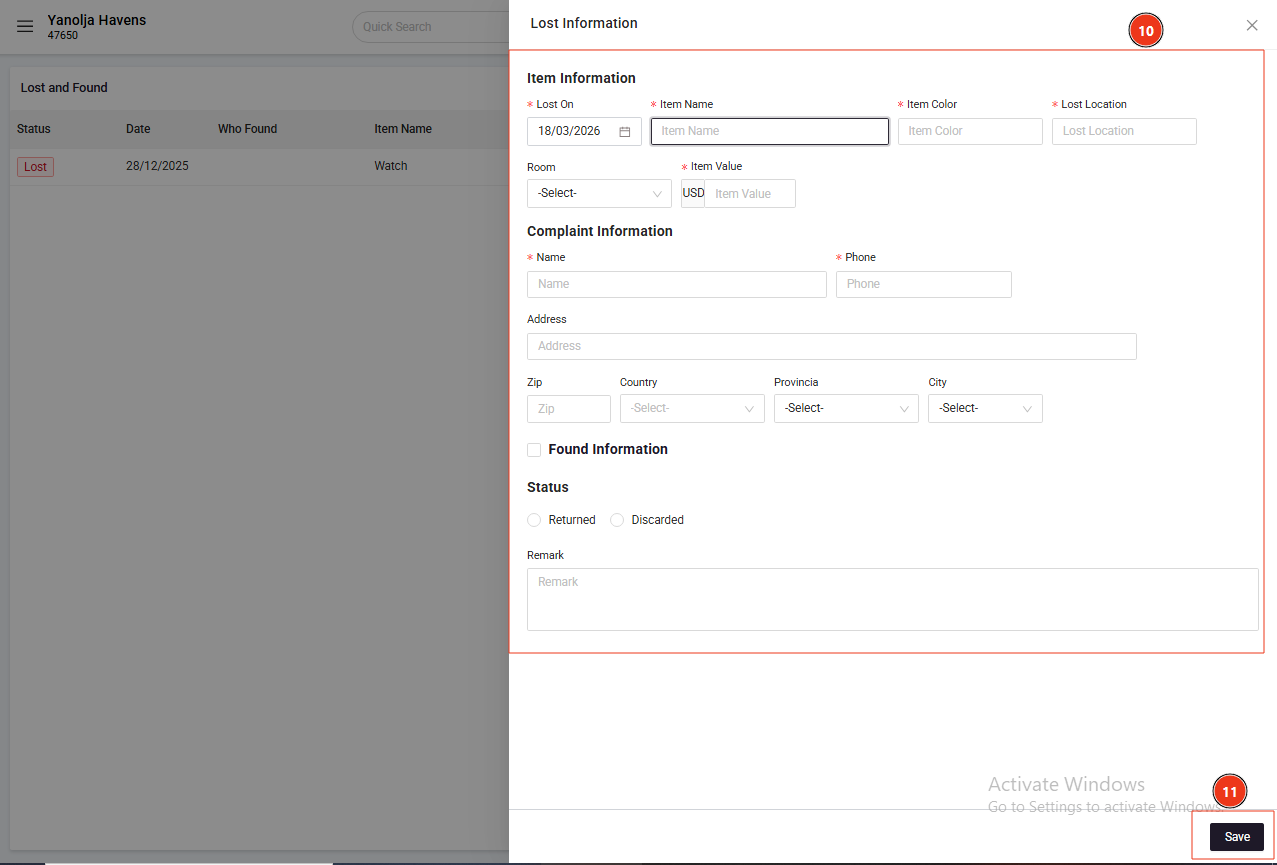 Lost and Found Management in PMS.