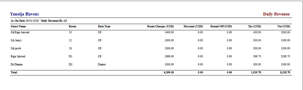 Tracking daily revenue is essential for monitoring a hotel’s financial performance. In PMS, users can generate a Daily Revenue Report to get a clear breakdown of earnings, including room charges, cancellations, and other additional charges.