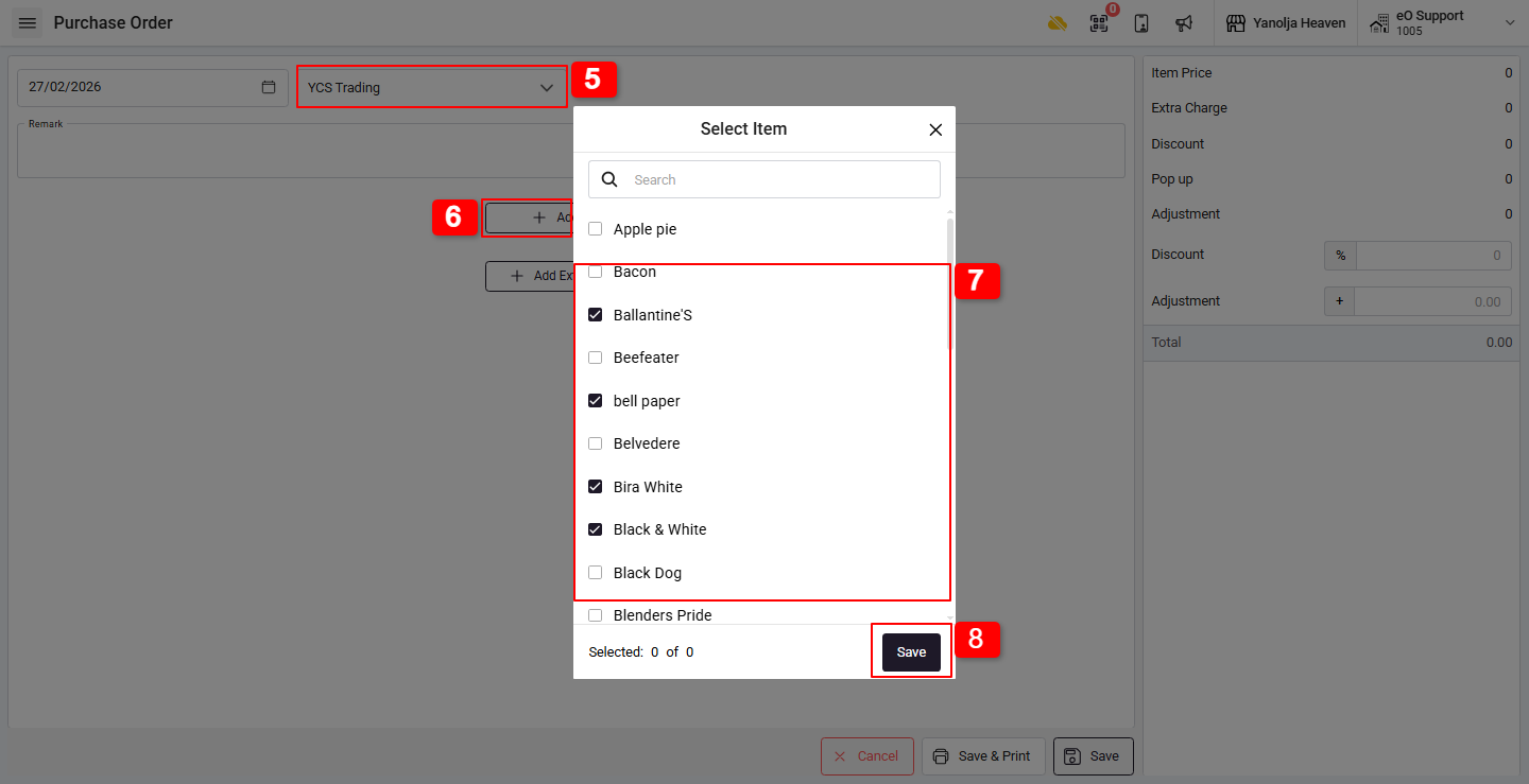 7. From the item list, select the required items.