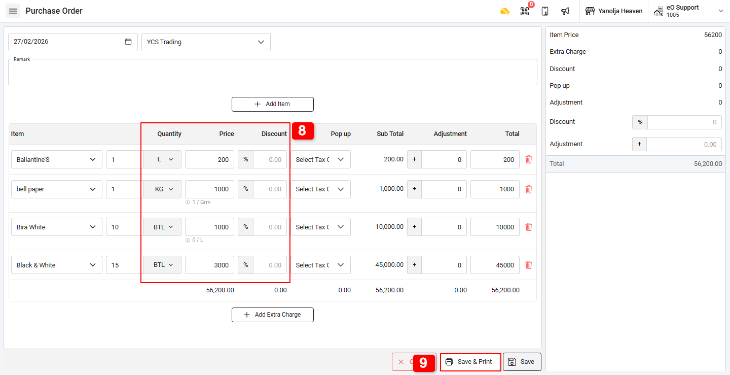 8. Enter the Quantity and Price for each item.