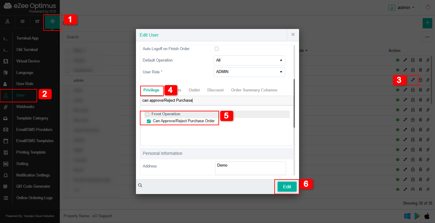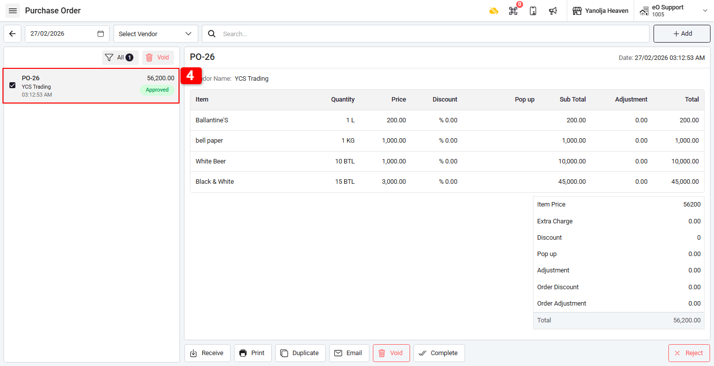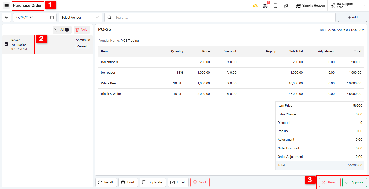 Based on user privileges configured in the POS backend (Outlet and User Level), the system allows authorized users to approve or reject Purchase Orders.