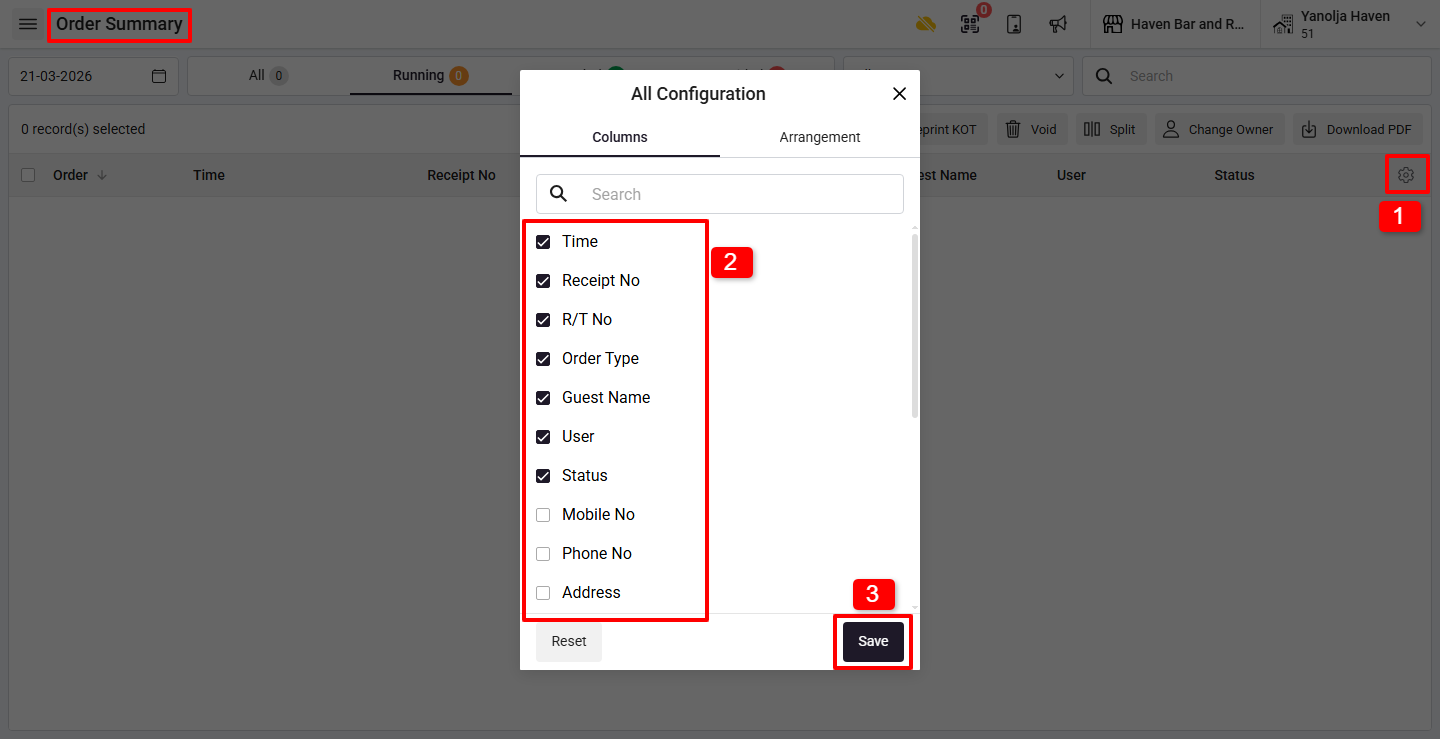 In Restaurant POS, the Column Selection option allows you to customize the Order Summary screen by adding or removing columns as per your requirement.