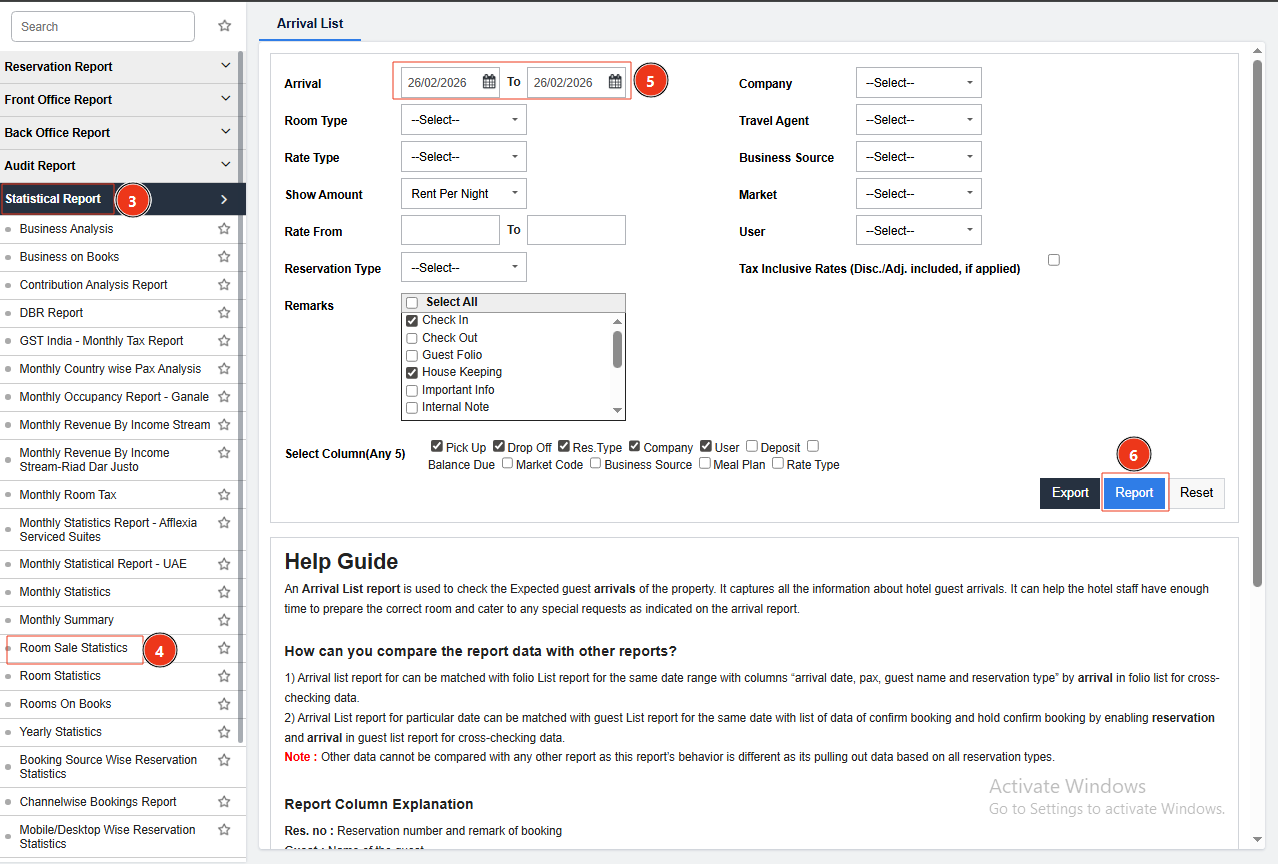 - Under the Statistical Report section, choose Room Sale Statistics.