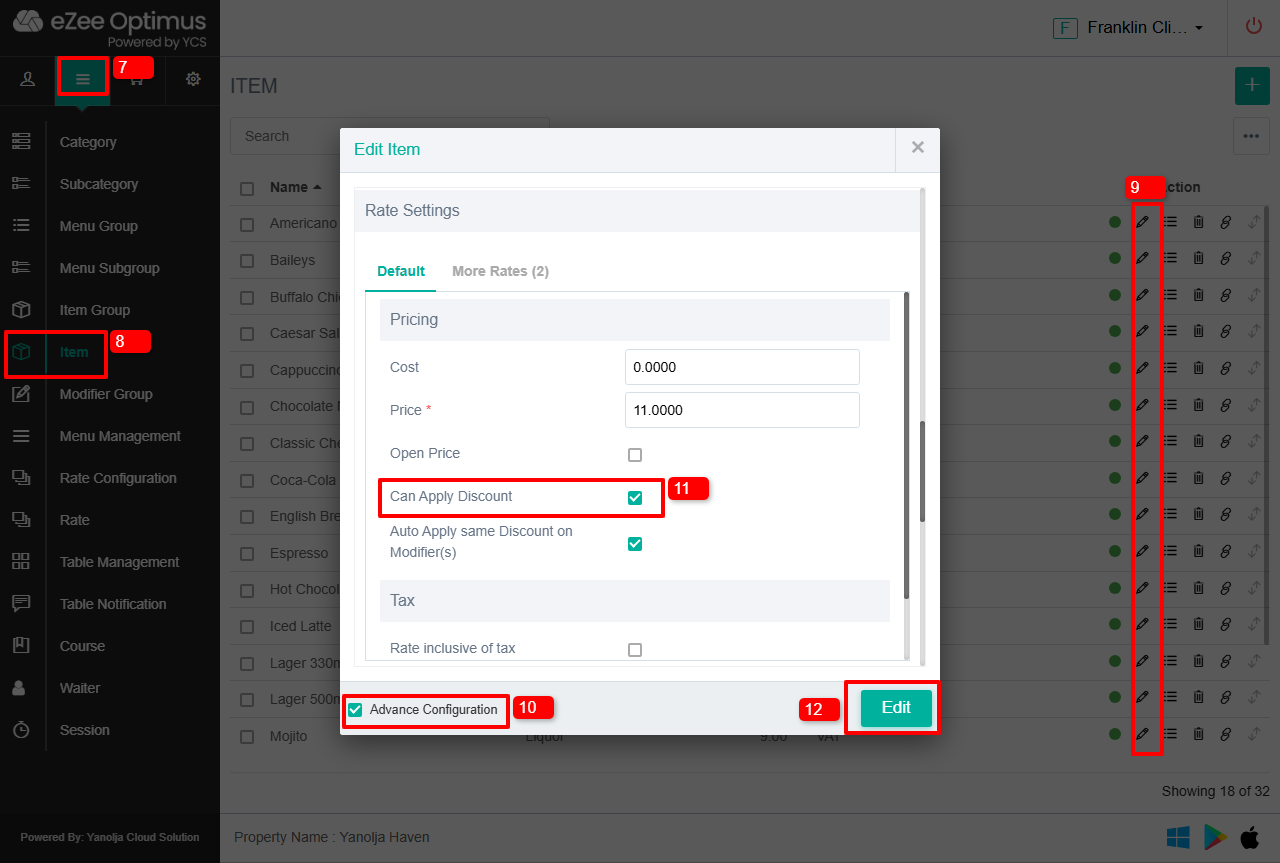 9. Click on Pencil icon/Edit button on the item.