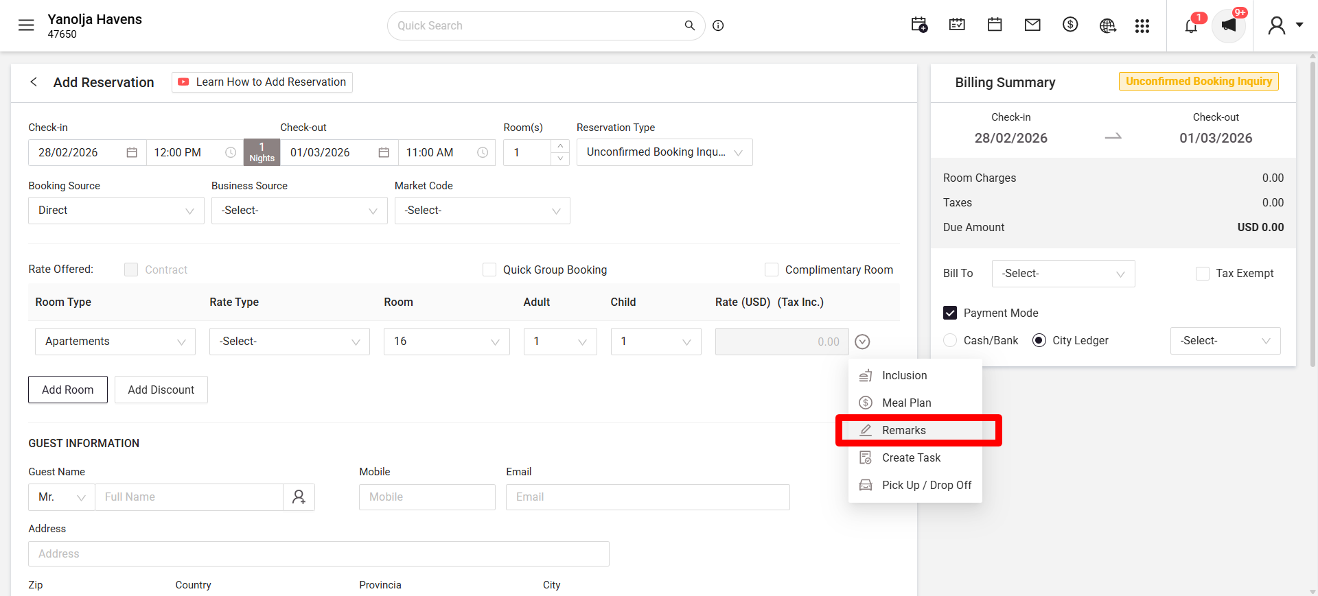 Refer to the below screenshot to add a remark at the Add Reservation screen.