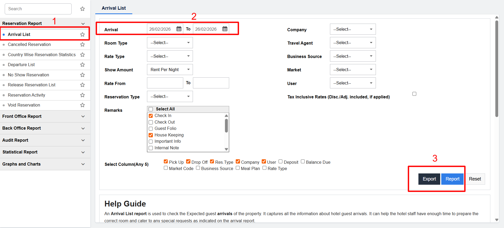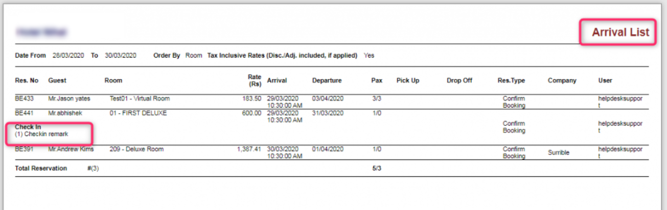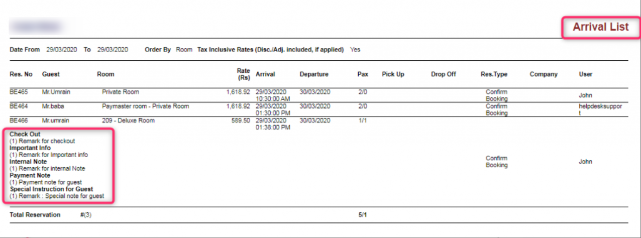 Additional remarks such as "Checkout," "Internal Note," "Important Info," "Special Note for Guest," and "Payment Note" can be utilized and are viewable in the Arrival List Report.