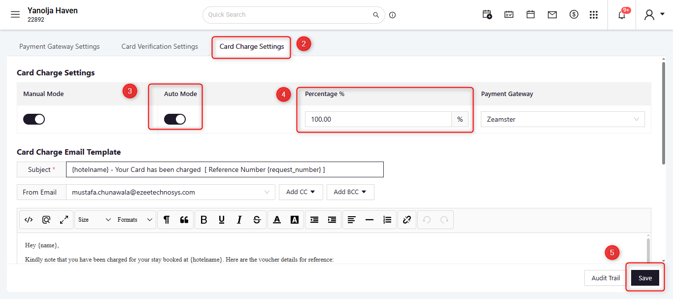 Once enabled, the system will automatically charge the configured percentage whenever a reservation is created or received with a saved credit card.