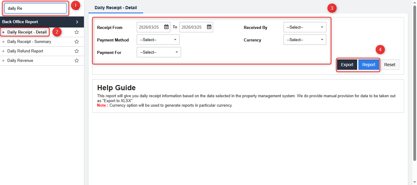 Select the Daily Receipt – Detail report.