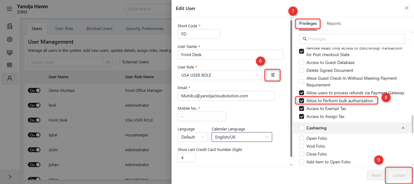 To use bulk authorization feature, ensure that the user has the required privileges enabled: