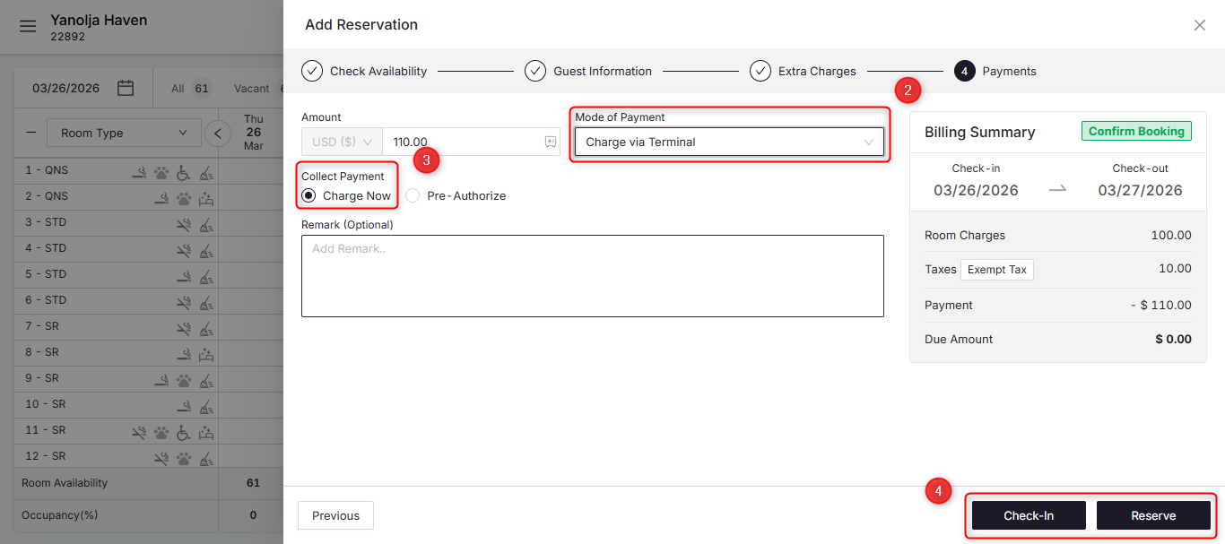 If a card is already saved in a reservation, it can be charged directly from the reservation.