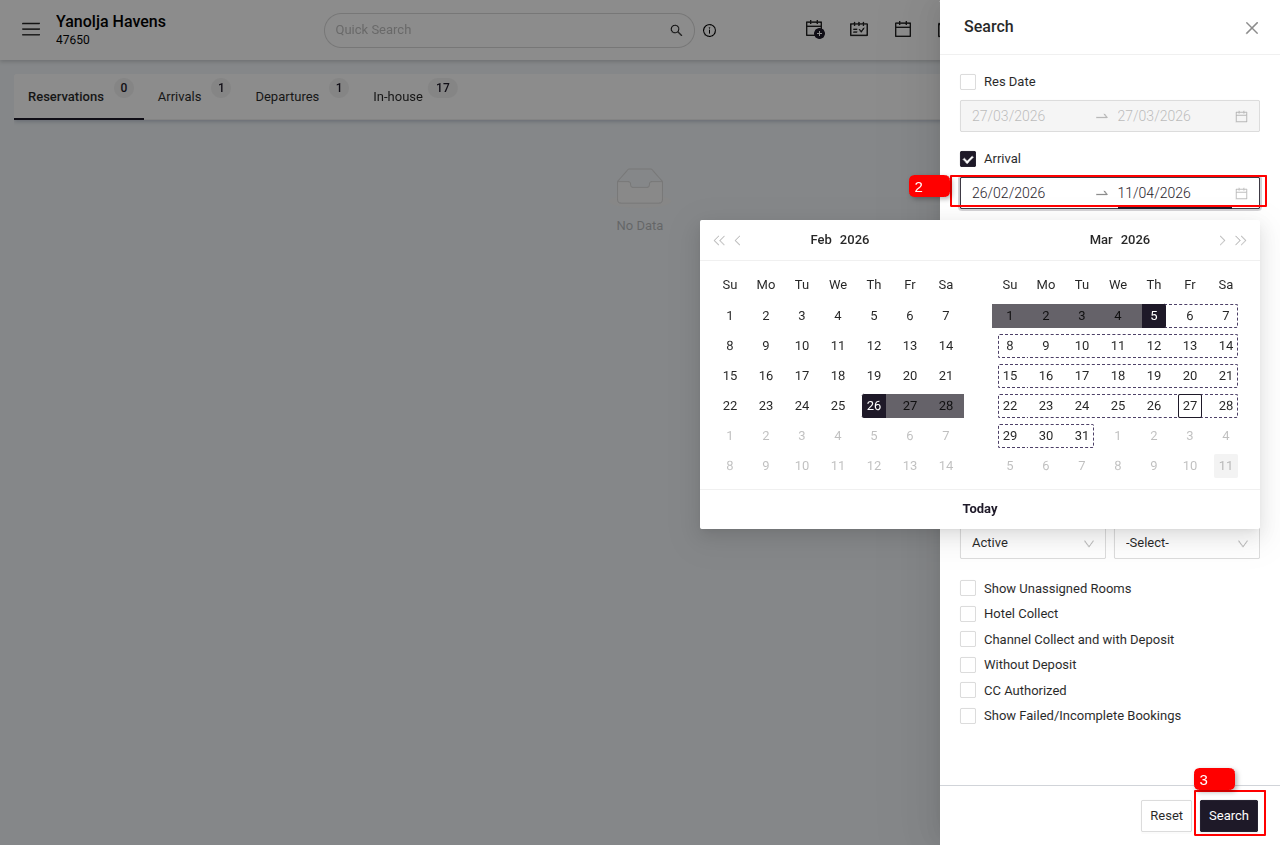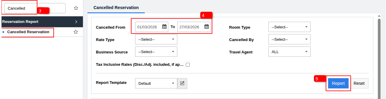 4 Select the date range for which you want to check cancelled reservations