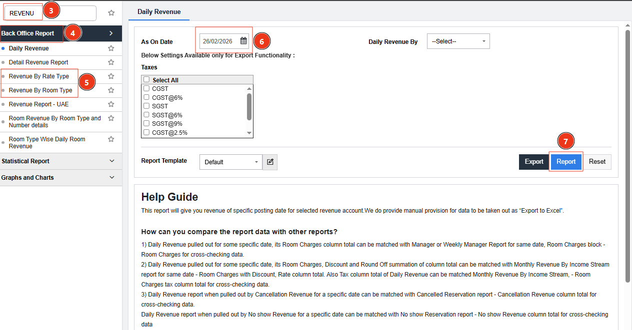 - Under Back Office Report, select either Revenue by Rate Type or Revenue by Room Type.