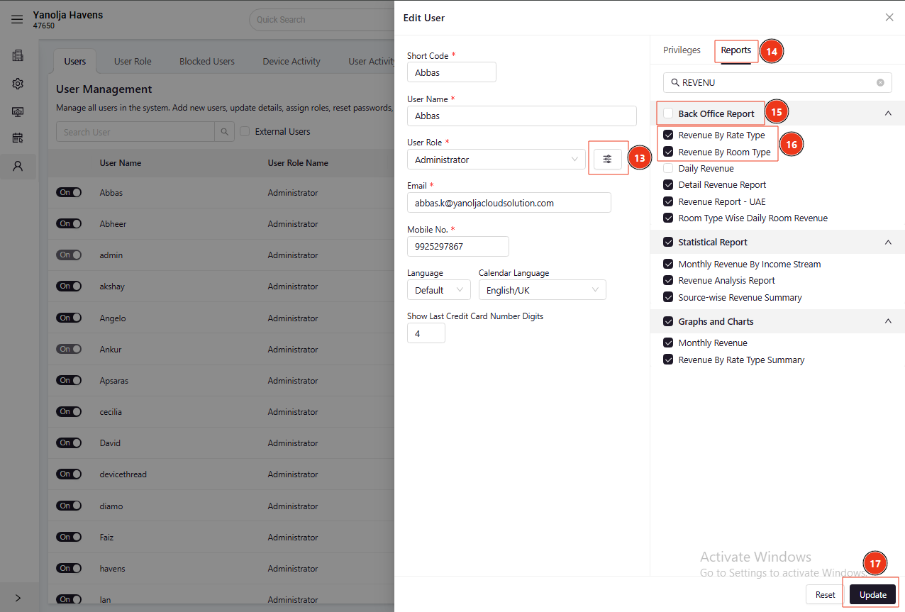 - Under Report privileges, enable access to Revenue by rate type and Revenue by room type.