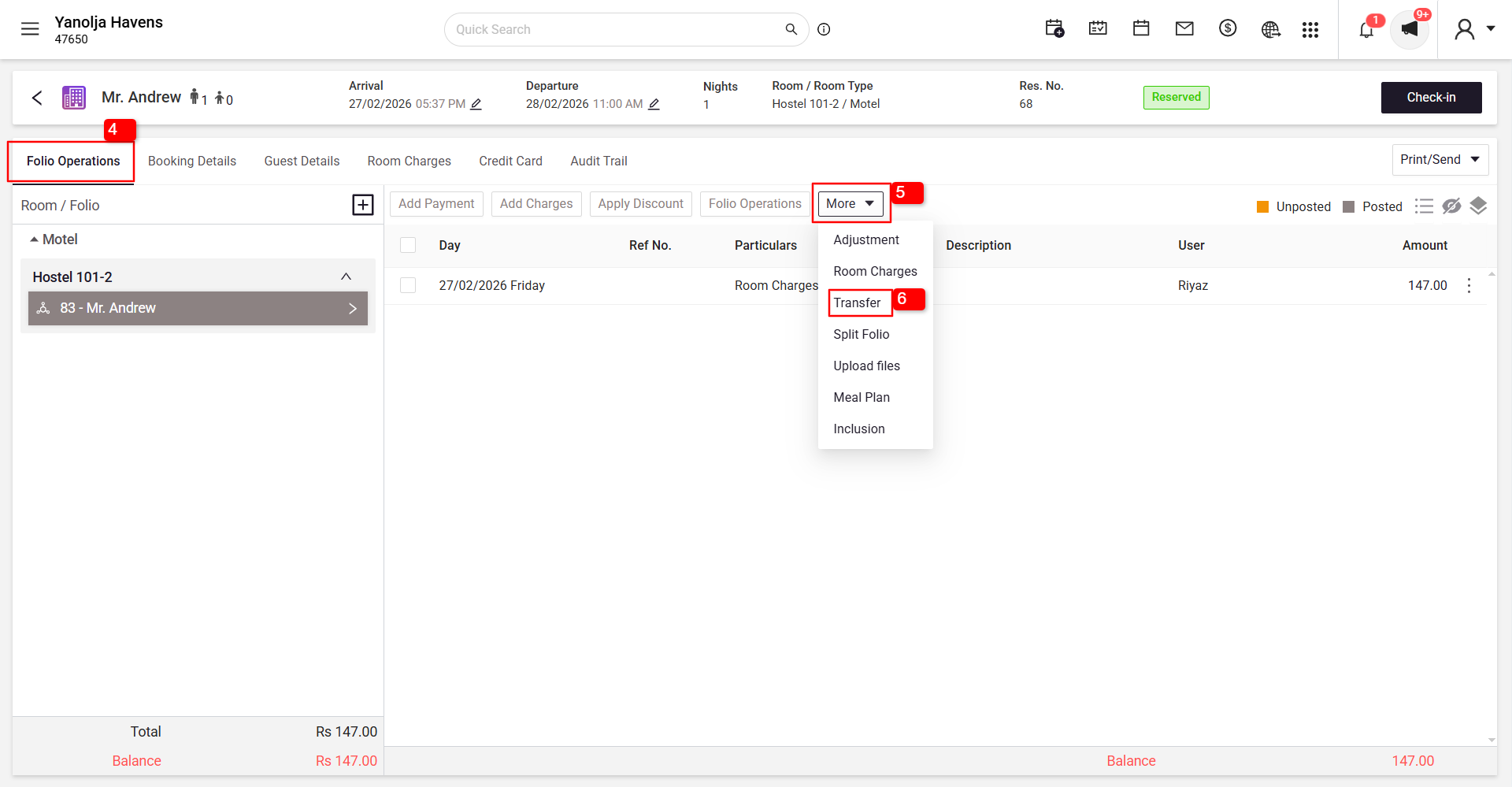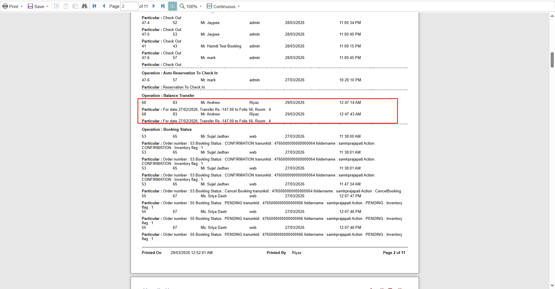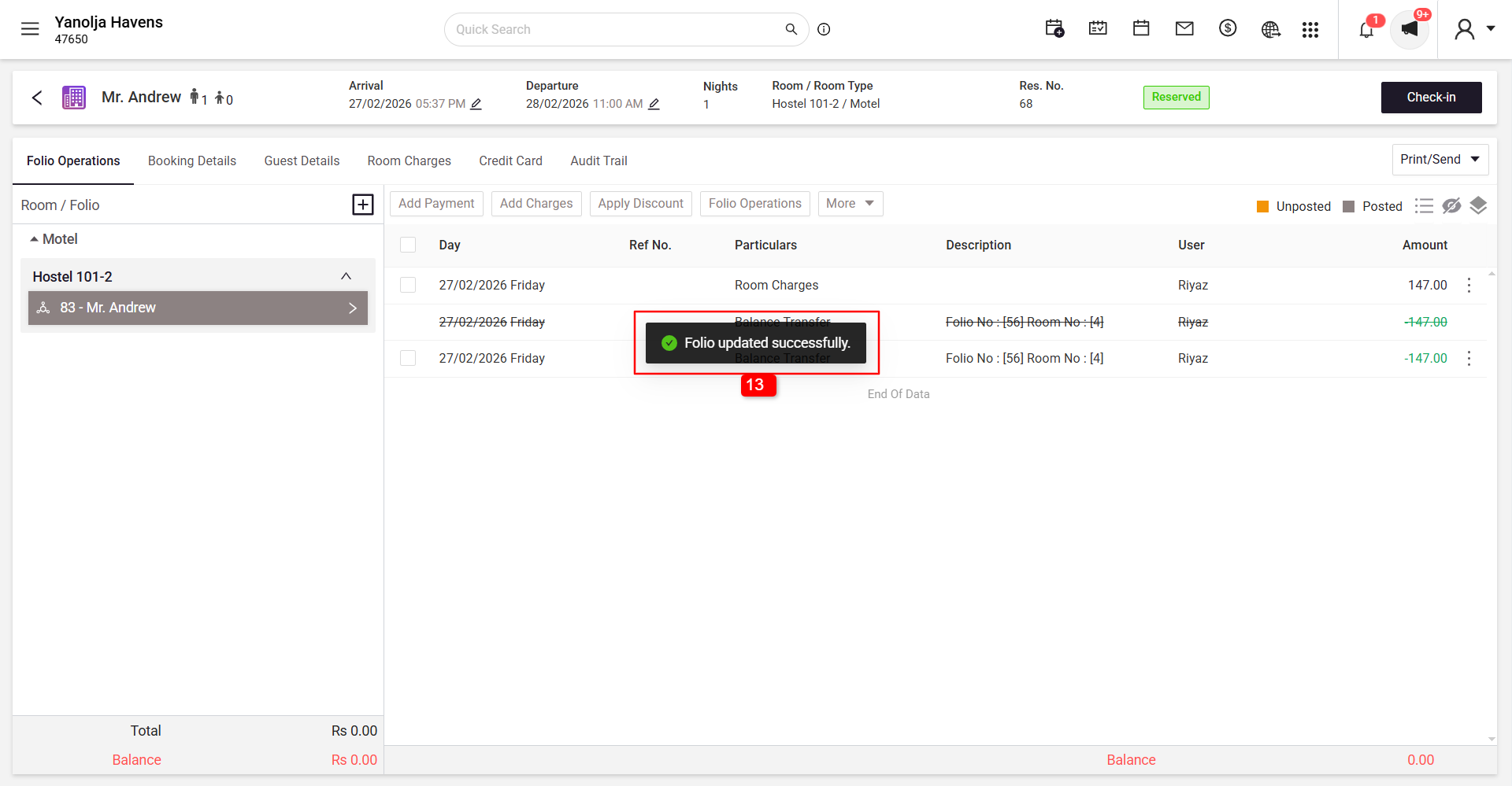 A balance transfer in the PMS System refers to the process of moving the entire financial balance (such as room charges, taxes, and other fees) from one folio (guest account) to another.