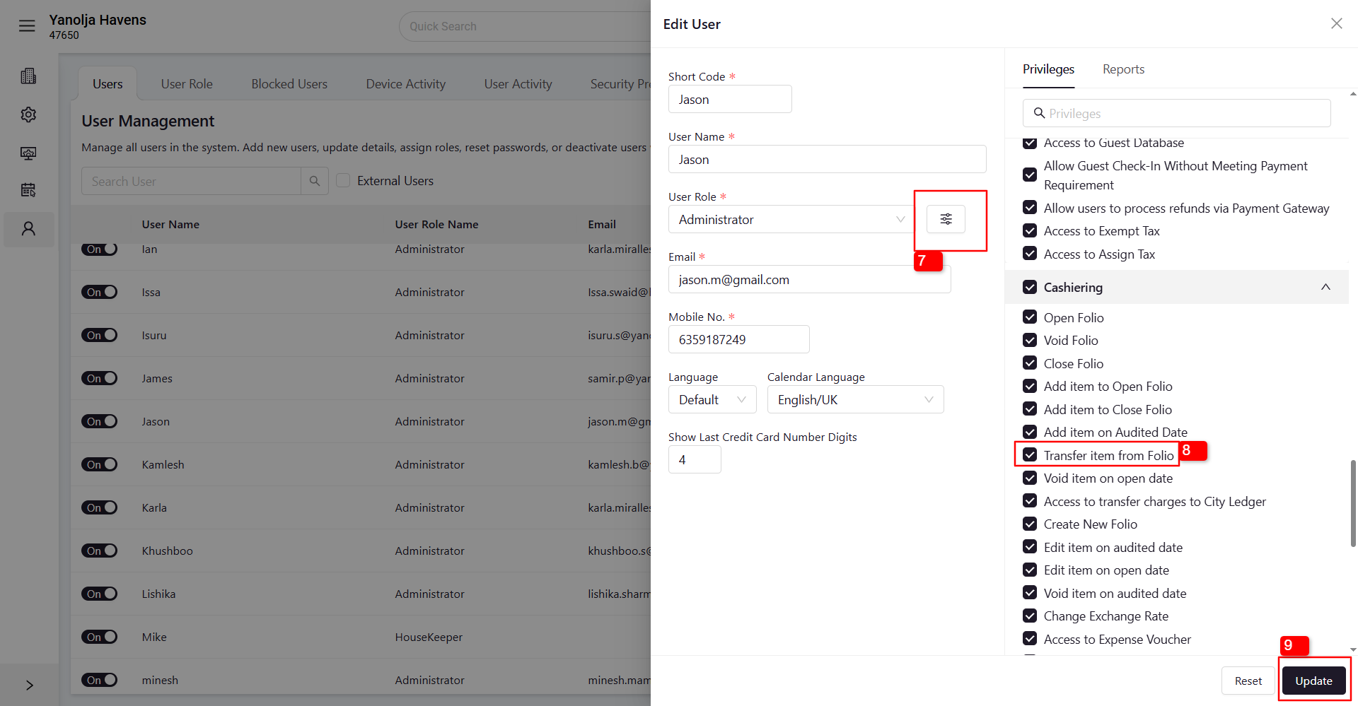 8 Under Cashiering Privileges, enable the Transfer Item from Folio option.