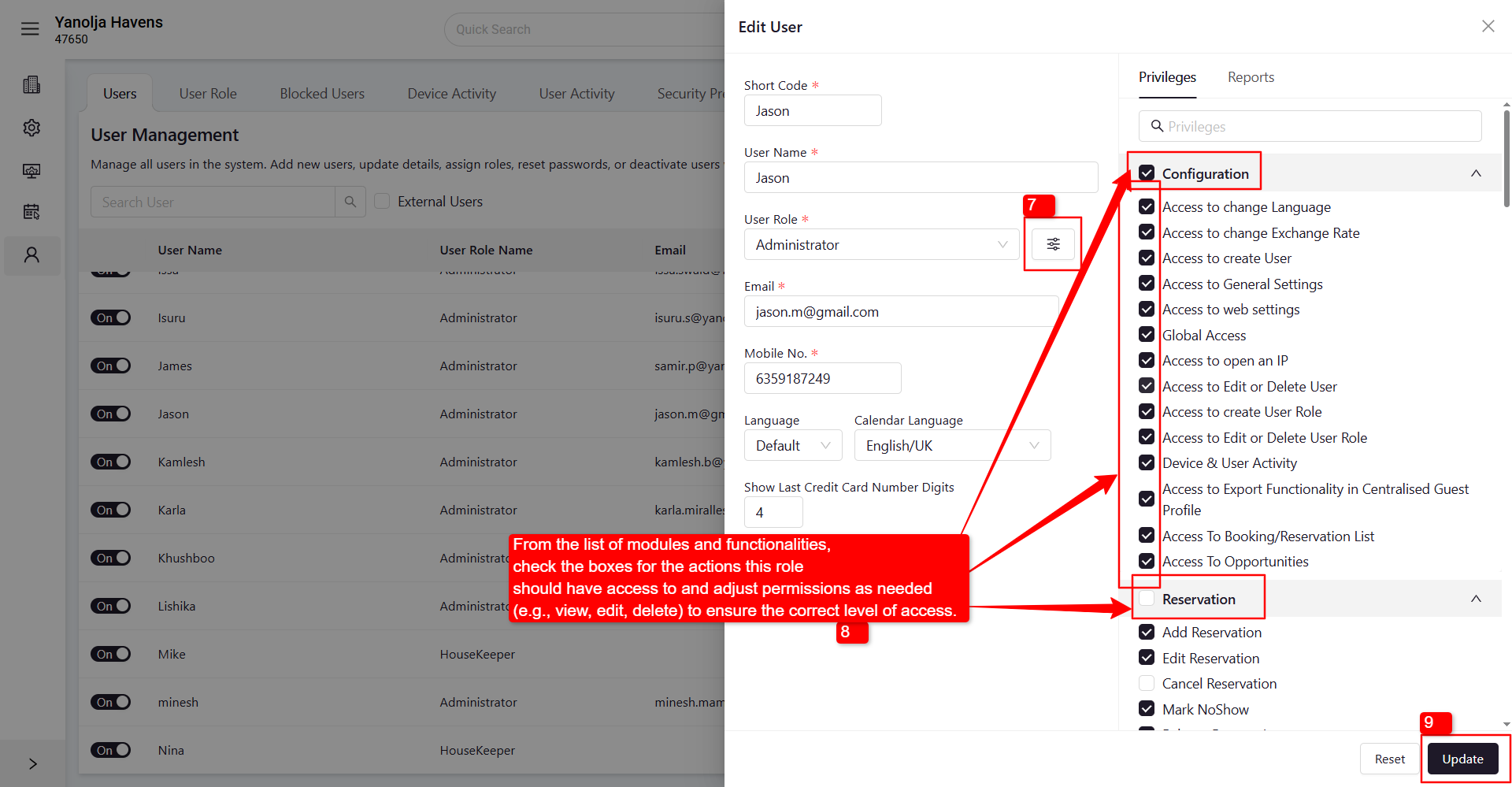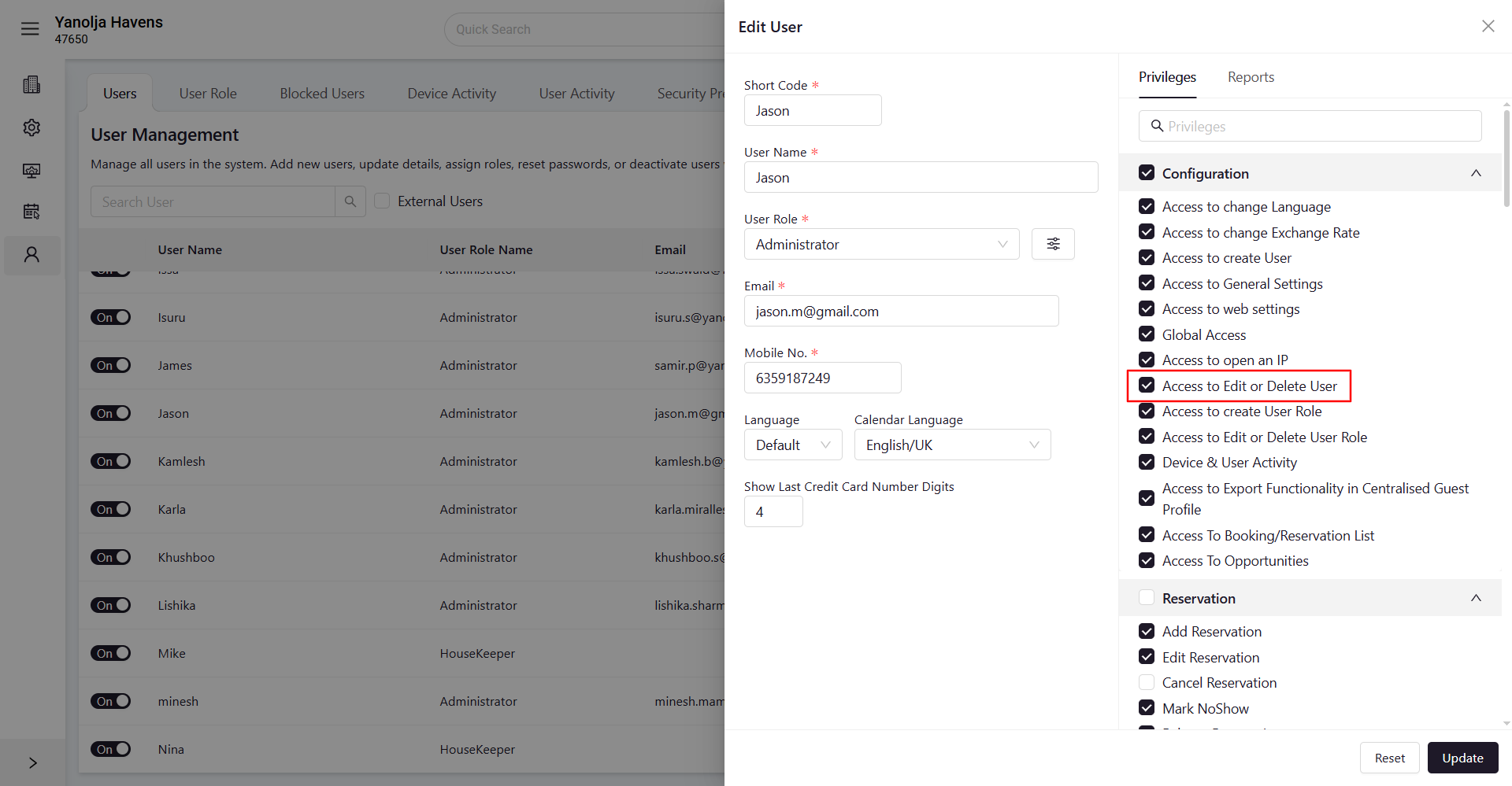 You can edit user privileges based on the roles and functions assigned to that user in the PMS System. Only users with proper rights can modify other users' privileges.