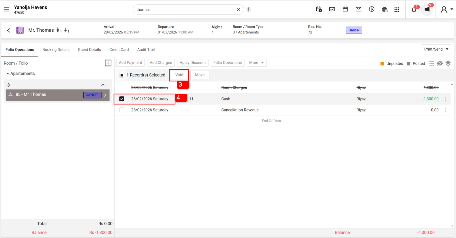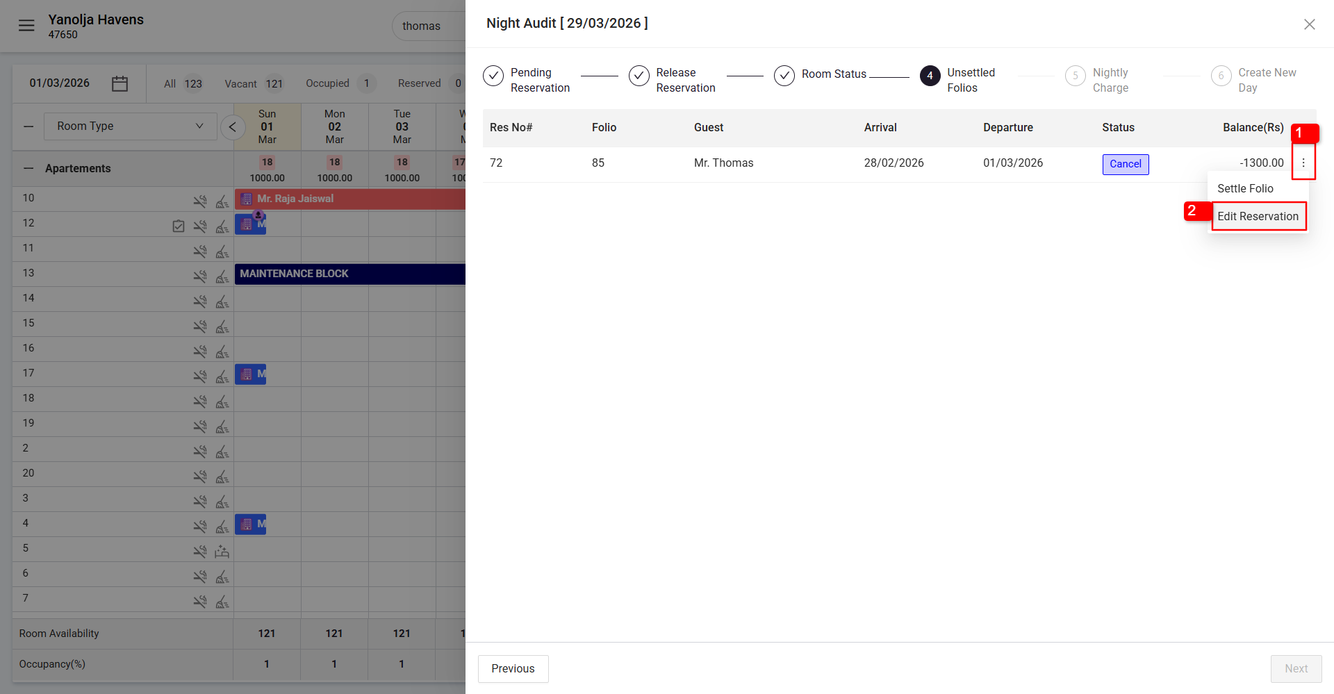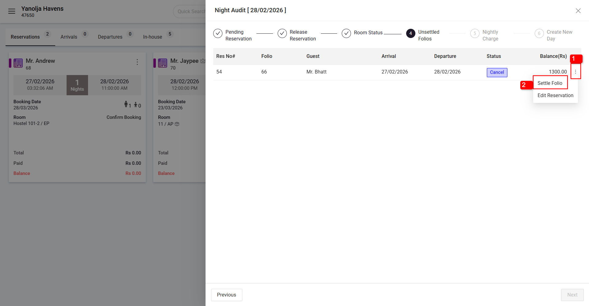While performing Night Audit, an unsettled folio may appear due to a negative balance. This usually occurs when guest folios have incorrect or excess payment entries.