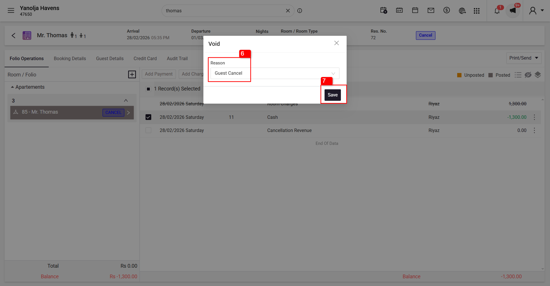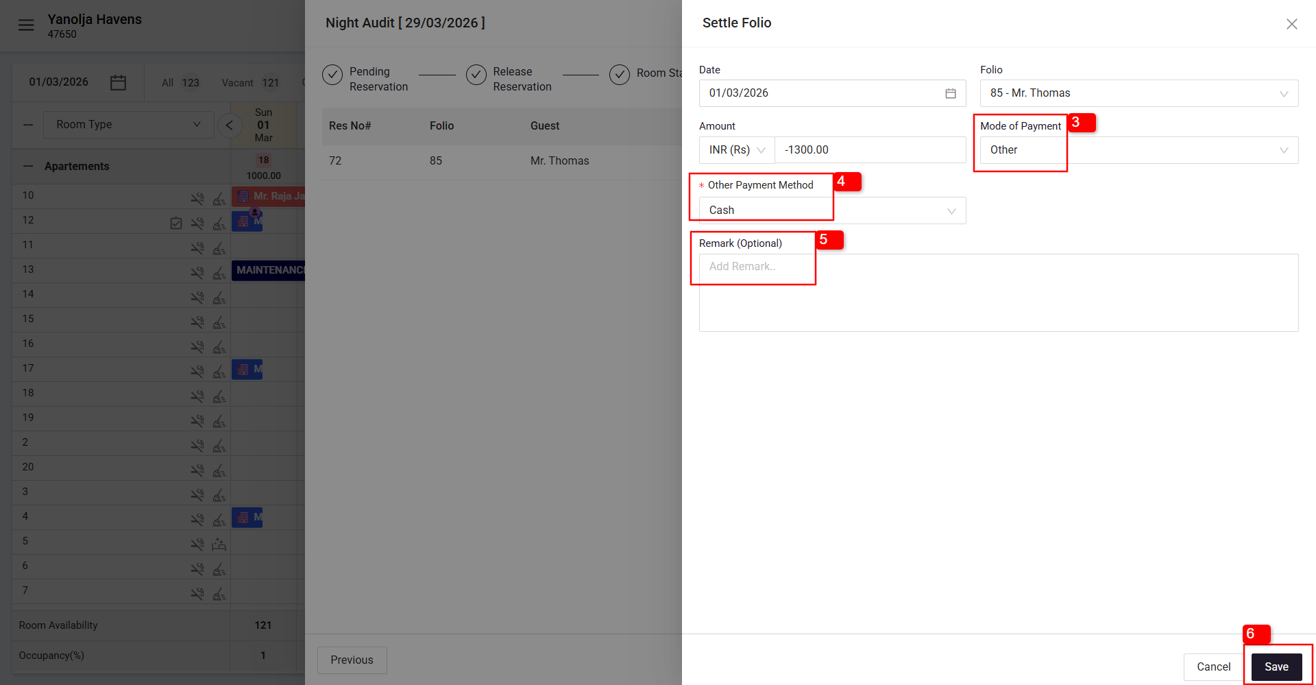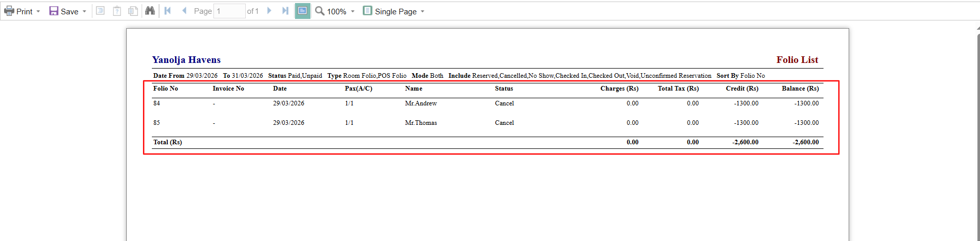 While performing Night Audit, an unsettled folio may appear due to a negative balance. This usually occurs when guest folios have incorrect or excess payment entries.