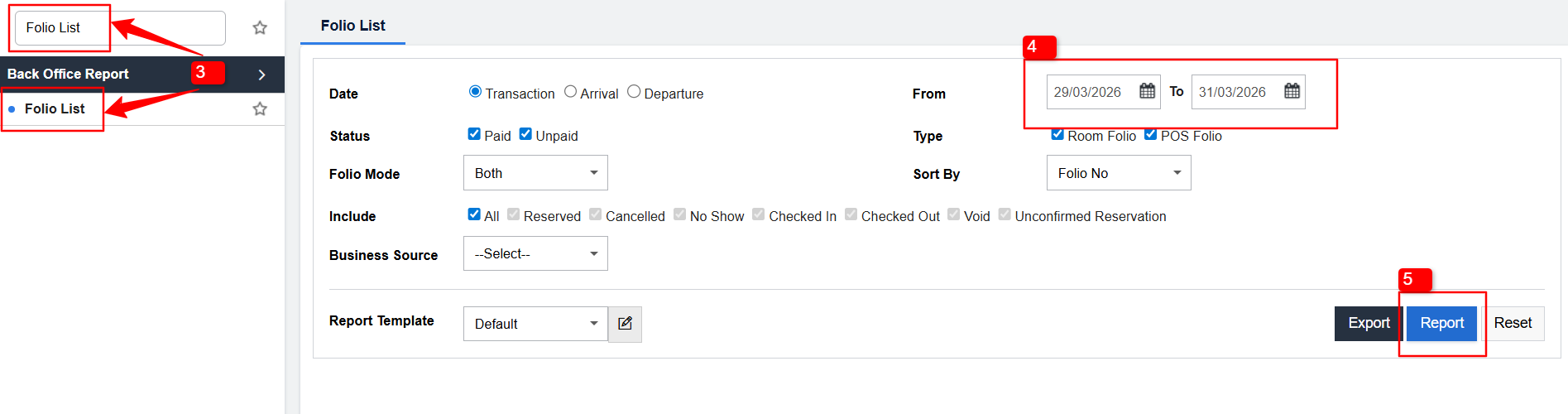 4 Select the date range for which you want to check folio operations.