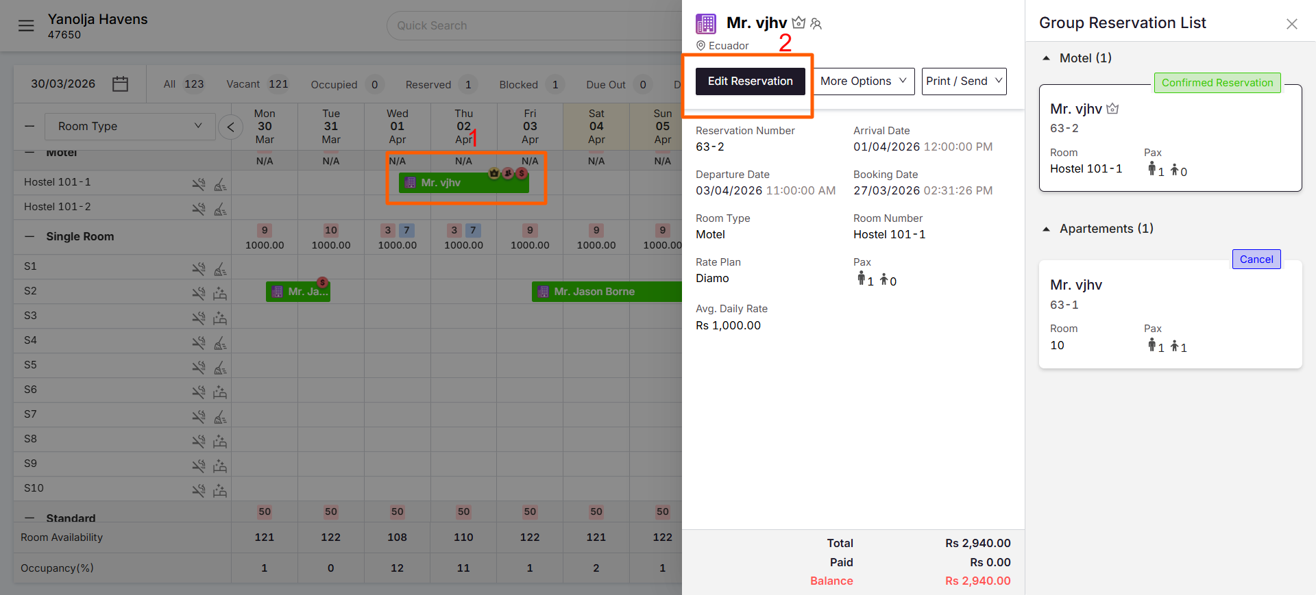 - Access Reservation: Go to Front Office > Group Reservations and open the desired reservation.