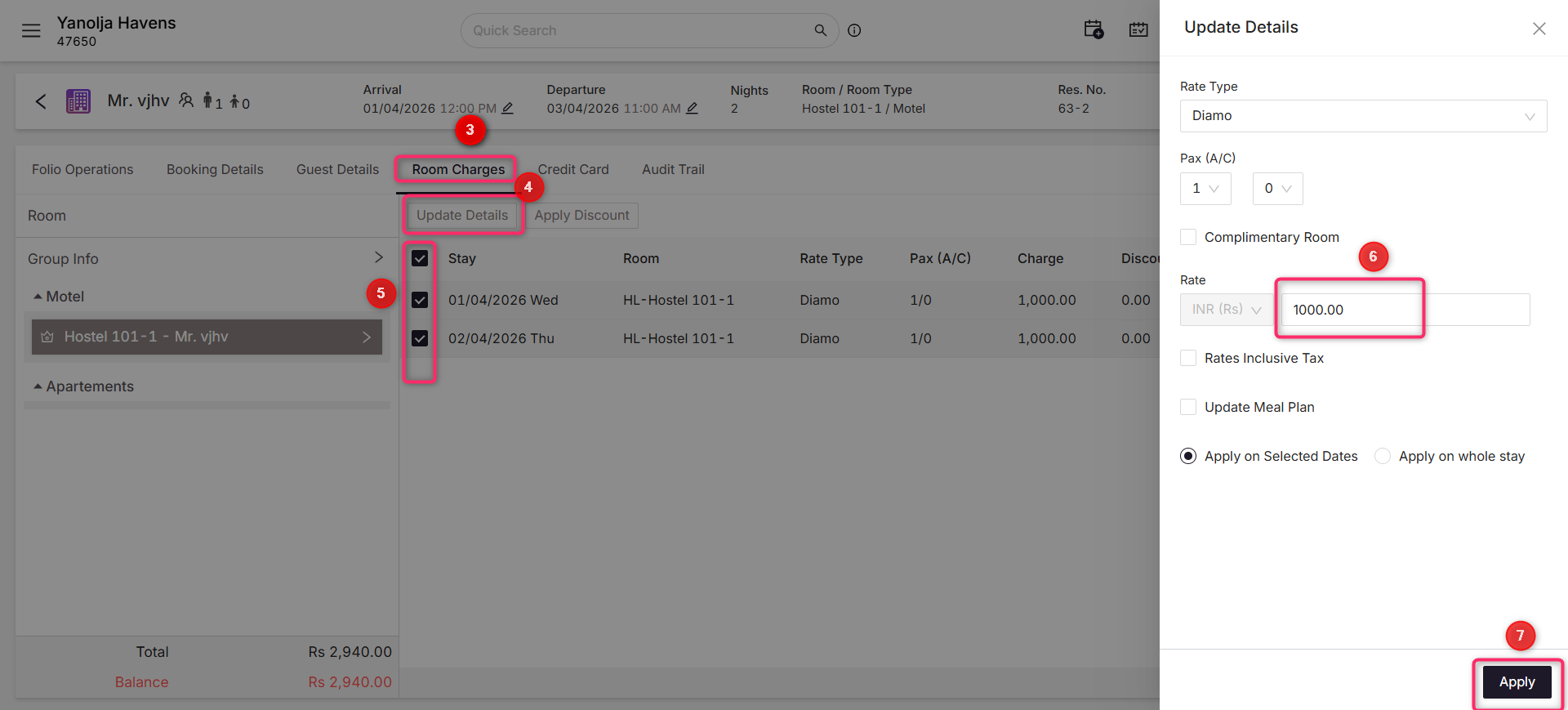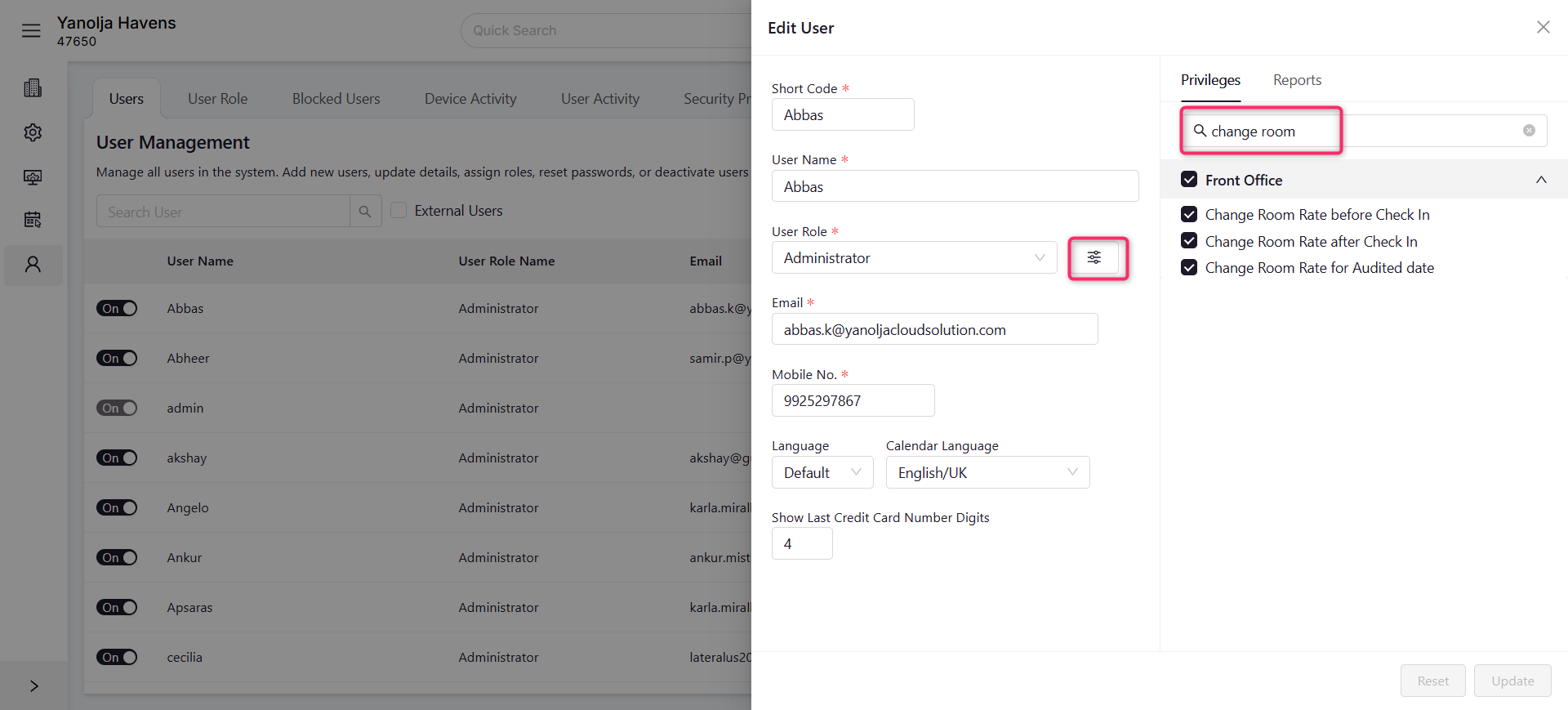 User privileges: To update the rates of group booking user must have the rights of edit reservation and Change Room Rate before Check In Change Room Rate after Check In Change Room Rate for Audited date.