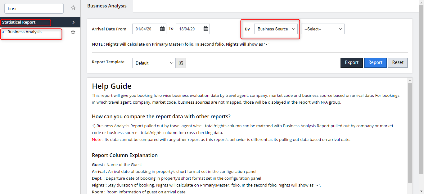 Reports: Select Business Analysis from the Report tab under Statistical Report.