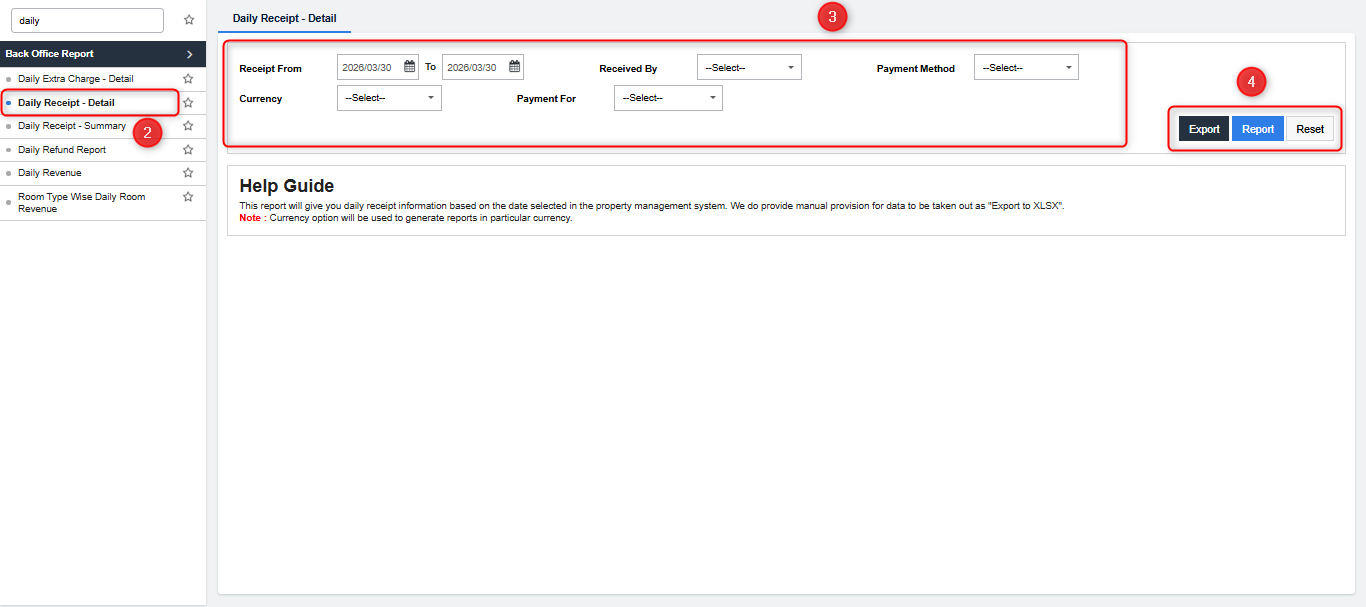 - A new window will open displaying all available reports. Search for Daily Receipt – Detail.