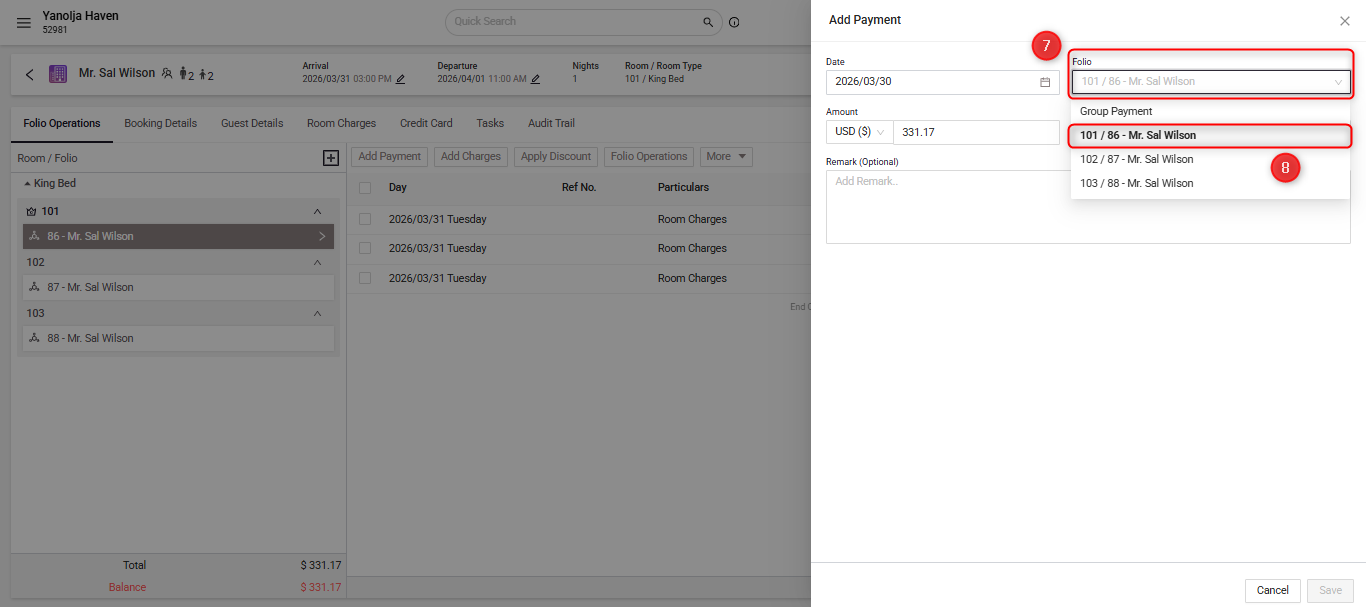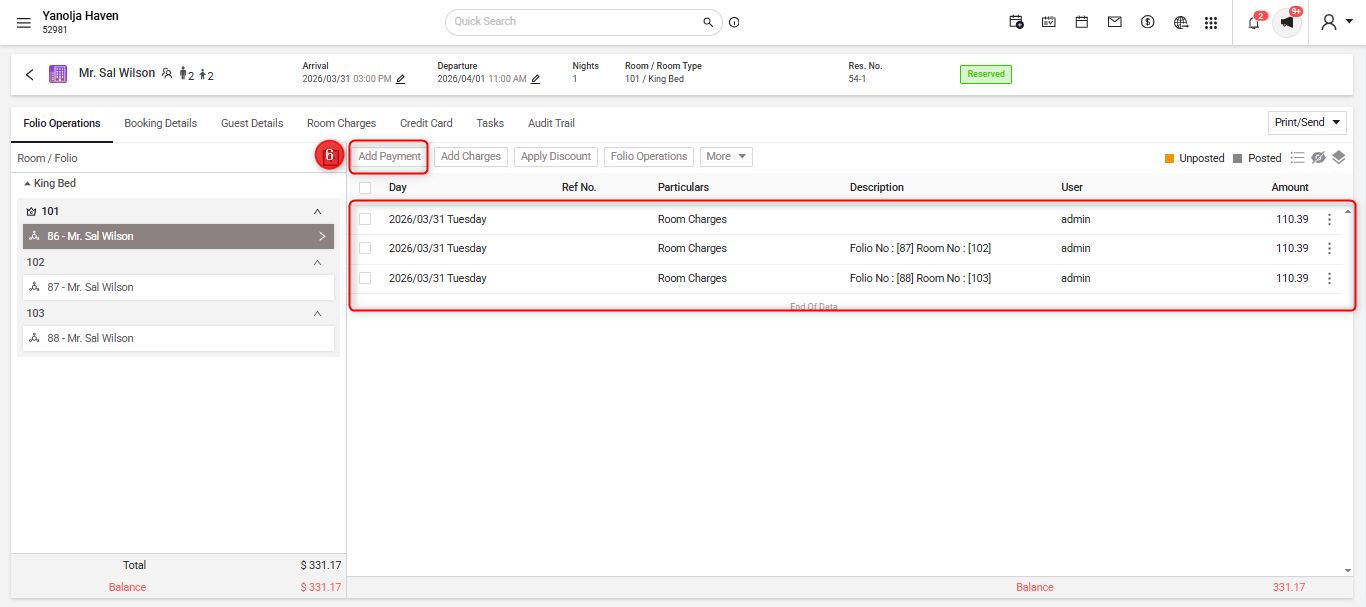 You can also confirm that the charges of the selected folios have been moved to the group owner and then to collect the payment, click on add payment.