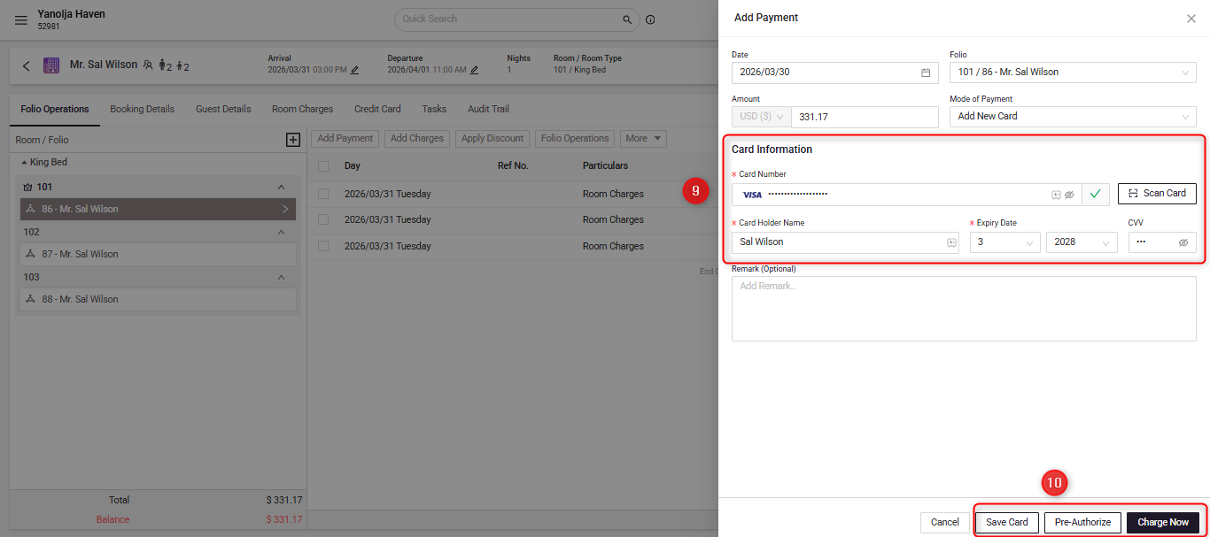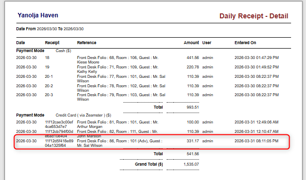 Note: Payments collected via Credit/Debit Card through a Payment Gateway cannot be split among individual folios. To divide payments across multiple folios, please use Cash / Business Source.