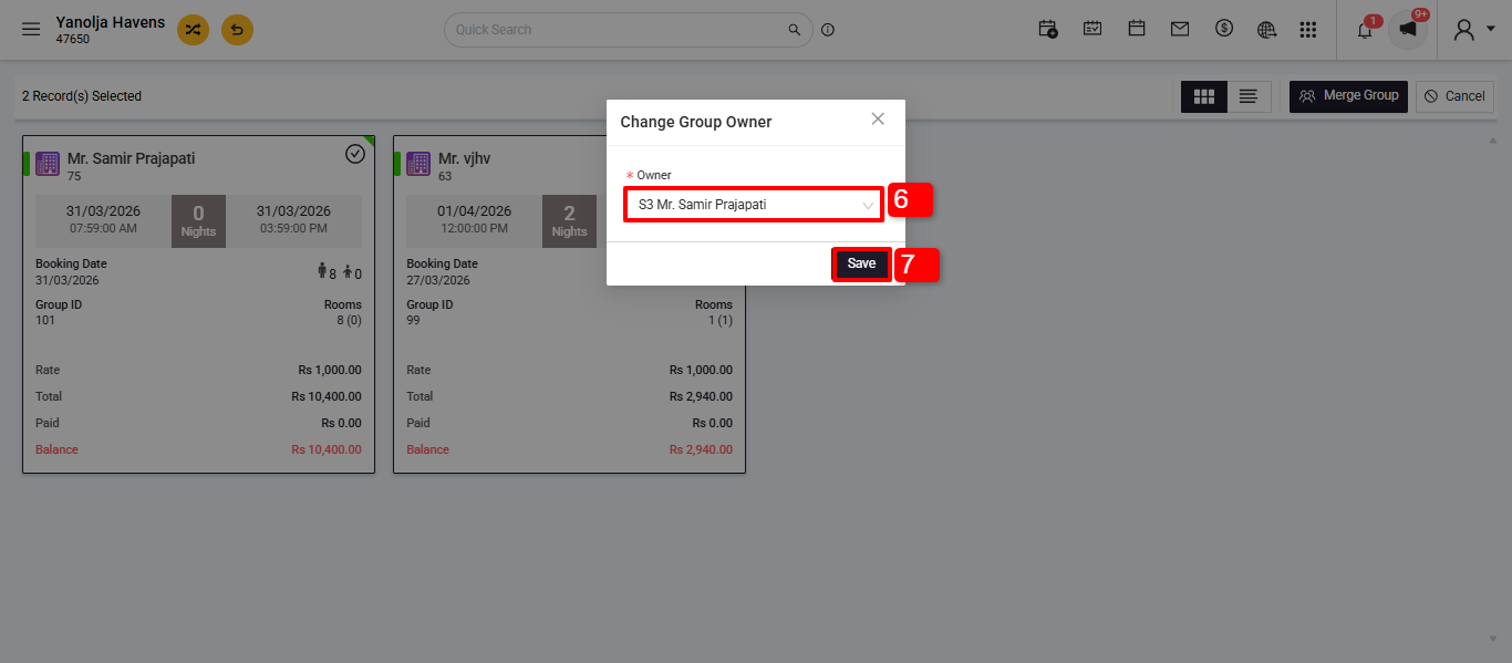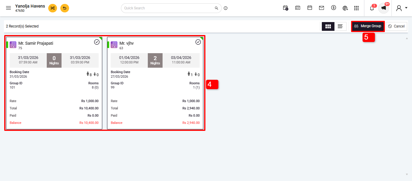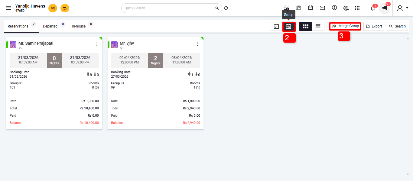 Note: Merge group reservations are only possible when the Booking status is a reservation. once the guest is checked in we can not merge group reservations.