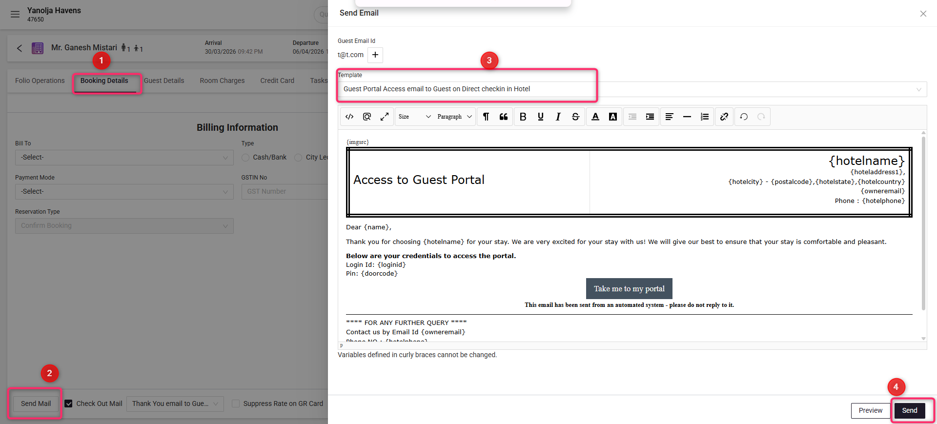 From the Template dropdown, select “Guest Portal Access email to Guest on Direct check-in in Hotel” (or your custom template).