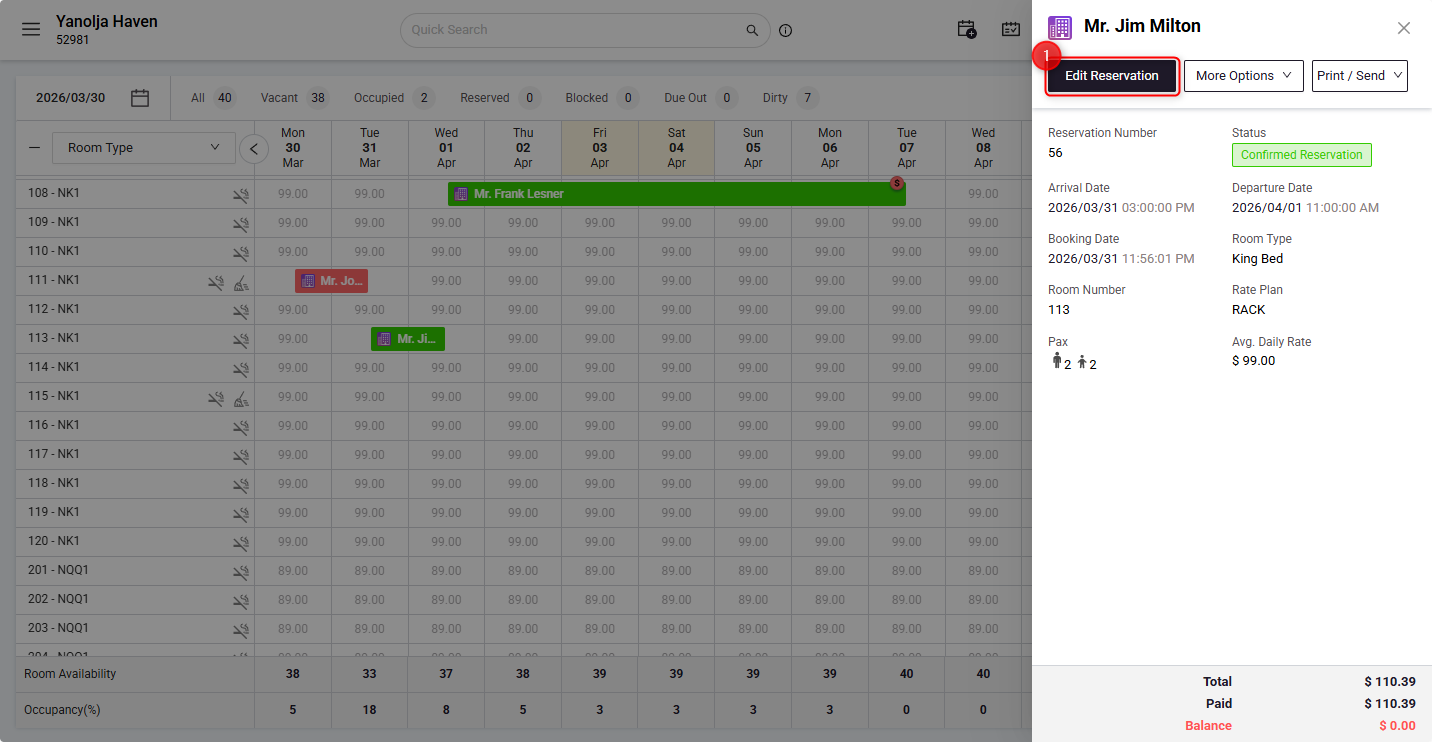 - Open the Guest Folio and click on Edit Reservation.