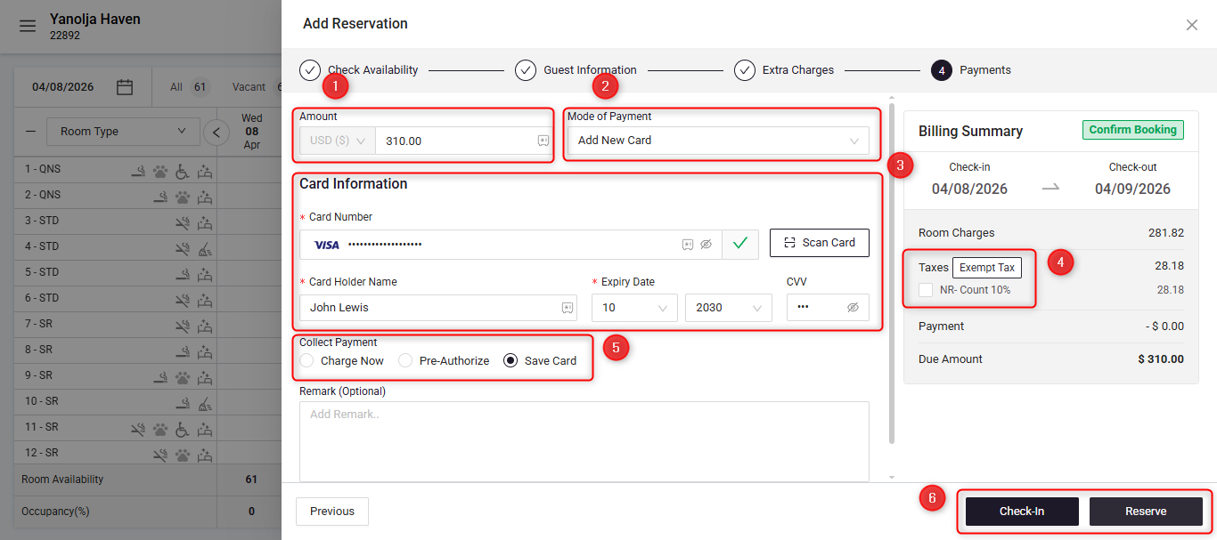 The final step is to collect payment or save payment details for the reservation.
